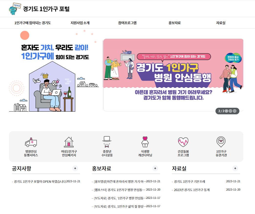 경기도에서 실시하는 1인 가구 정책, 시군별 참여 프로그램 등을 한눈에 볼 수 있는 누리집 ‘경기도 1인가구 포털(https://www.gg.go.kr/1ingg)’이 2023년 12월 7일 문을 열었다고 합니다.
