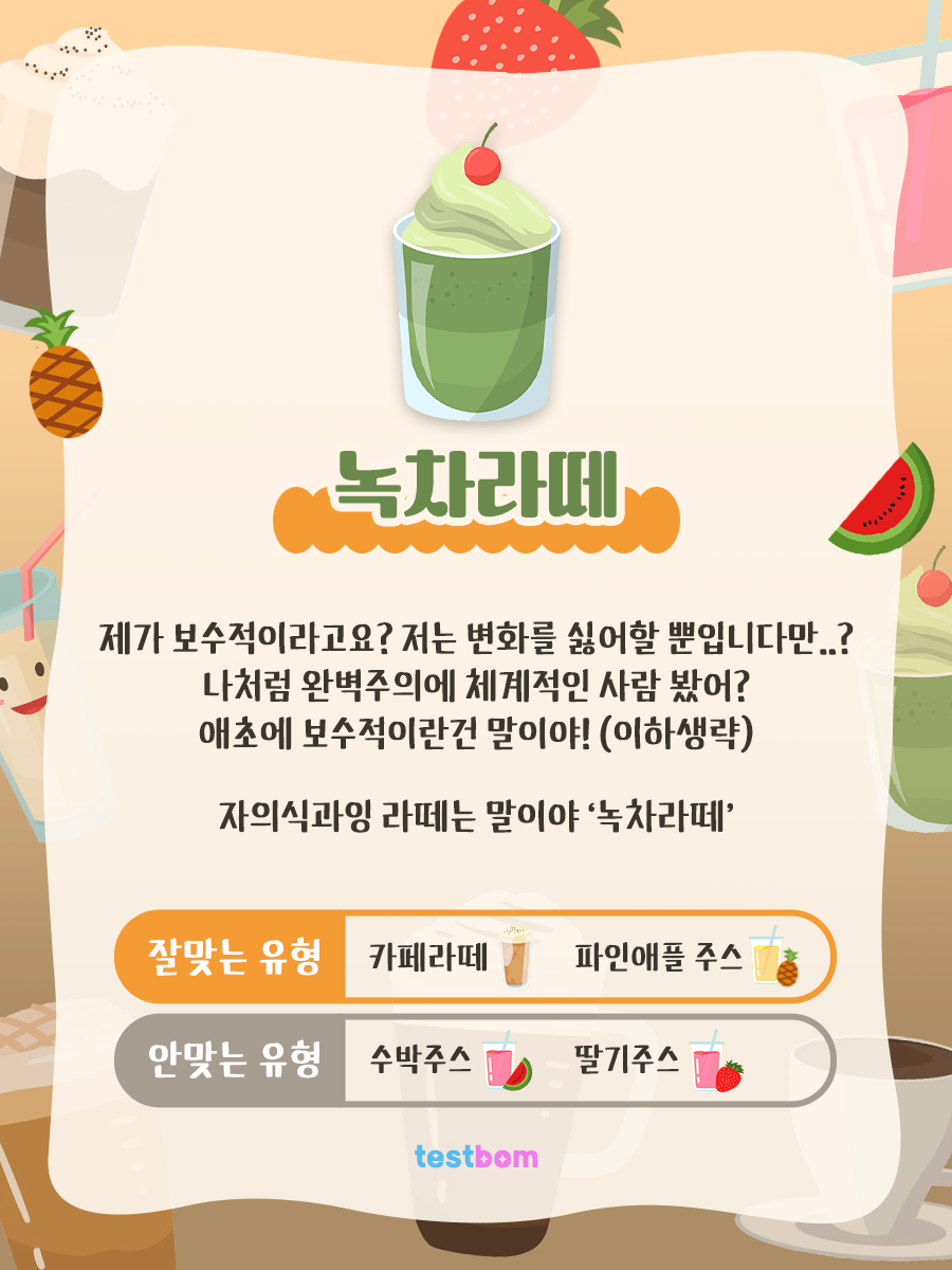 테스트봄이라는 다양한 재밌는 테스트를 만드는 사이트에서 카페 음료로 알아보는 16가지 성격을 찾아보는 ‘카페 음료 성격 테스트’가 나왔습니다.