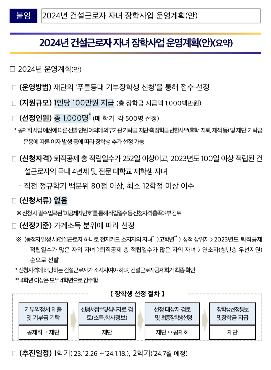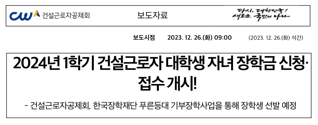 건설근로자공제회는(이사장 김상인, 이하 ‘공제회’)는 한국장학재단(이하, ‘재단’)을 통해 2024년 1학기 푸른등대 건설근로자공제회 기부 장학생 신청·접수를 개시한다고 밝혔습니다.