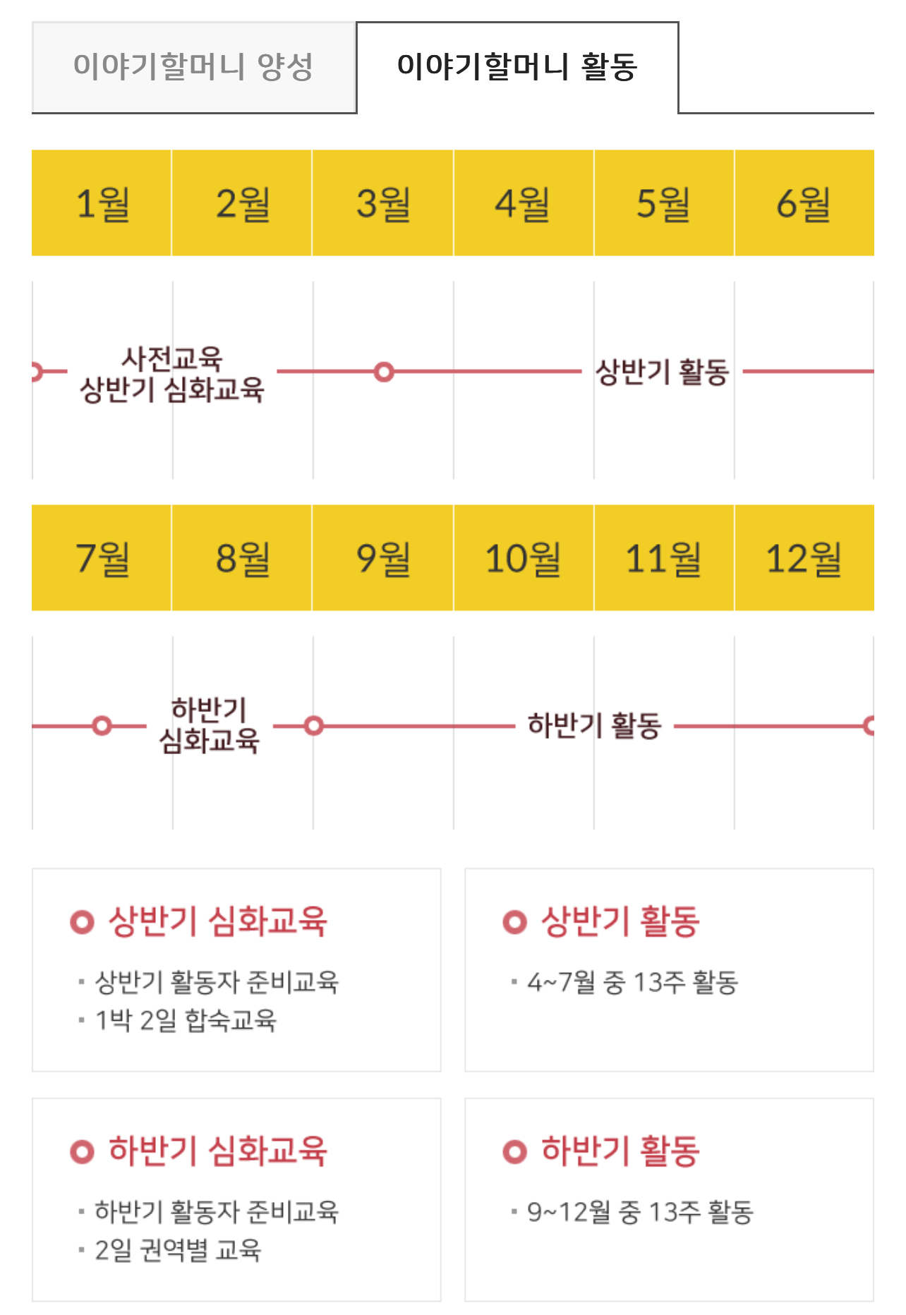 ※ 신규 활동 예정 이야기할머니의 경우 상반기 심화교육을 사전교육으로 대체하며 현장 활동에 필요한 전반적인 사항들을 교육