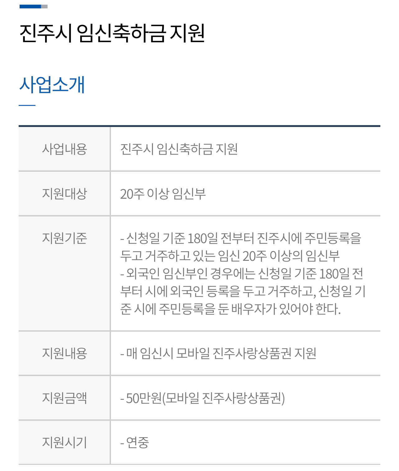 - 신청일 기준 180일 전부터 진주시에 주민등록을 두고 거주하고 있는 임신 20주 이상의 임신부