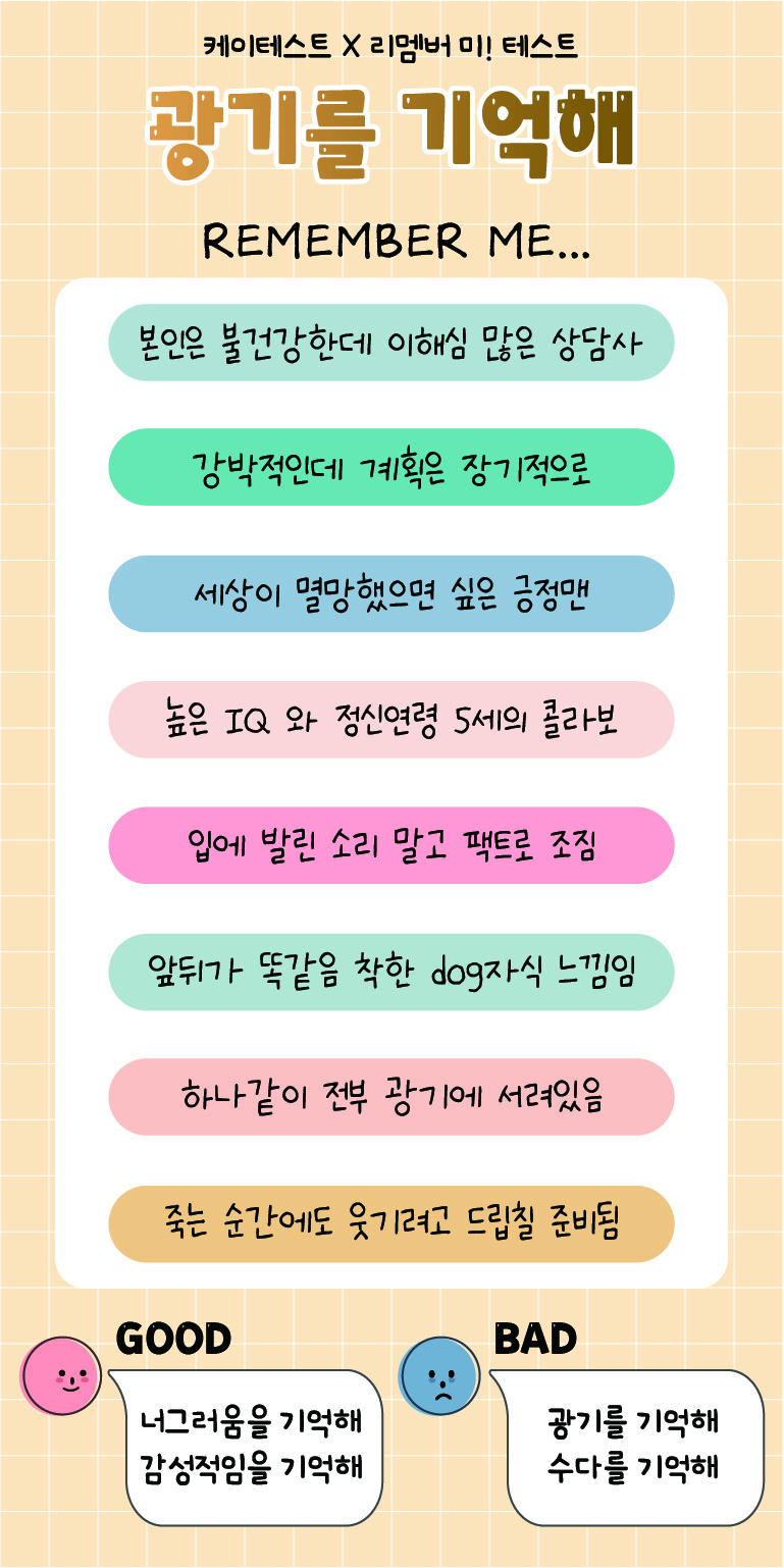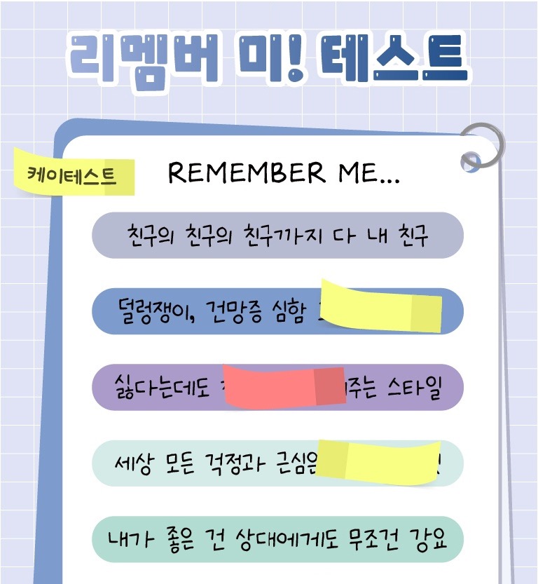 케이테스트라는 다양한 재밌는 테스트를 만들어 제공하는 사이트에서 “나는 이런 사람이야”를 알려주는 리멤버 미! 테스트가 나왔다는데 여러분들께 소개드리려고 합니다.