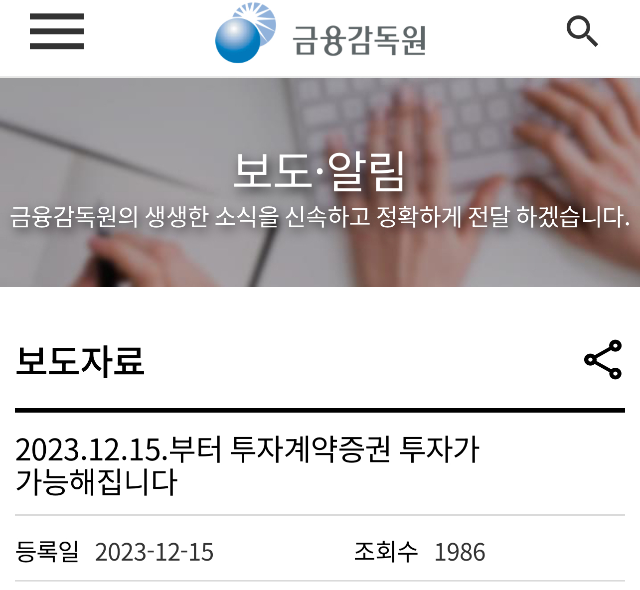 투자계약증권을 활용한 조각투자 첫 사례가 2023년 12월 15일 나왔다고 합니다.