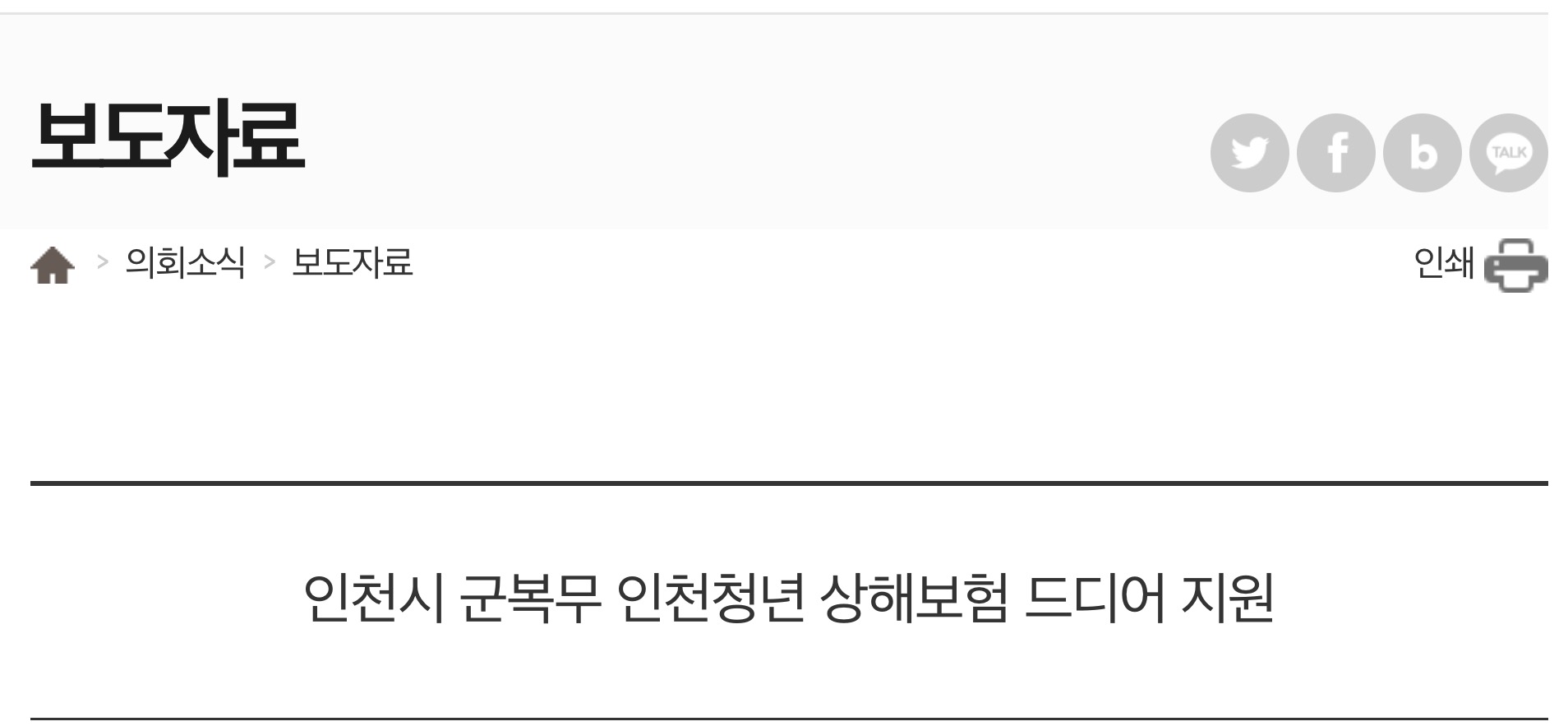 인천광역시는 앞으로 군복무 청년들이 불의의 사고에 대비하여 상 해보험 가입을 지원하여 군 복무 중인 청년이 복무하다 다치면 보상 을 받을 수 있게 되었다고 합니다.