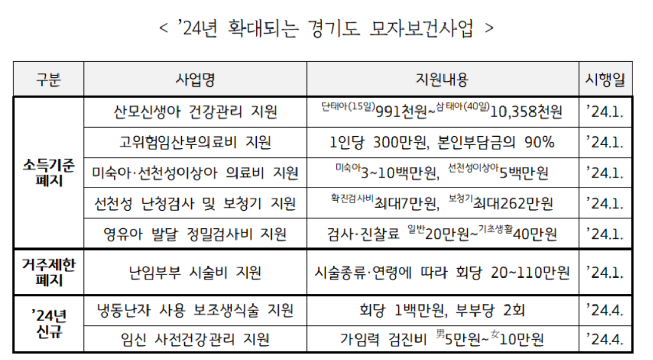 우선 2024년 1월 1월부터 ▲산모신생아 건강관리 지원 ▲고위험임산부의료비 지원 ▲미숙아·선천성이상아 의료비 지원 ▲선천성 난청검사 및 보청기 지원 ▲영유아 발달 정밀검사비 지원 등 5개 사업의 신청 대상 소득기준을 전면 폐지해 더 많은 경기도민이 혜택을 볼 전망이라고 합니다.