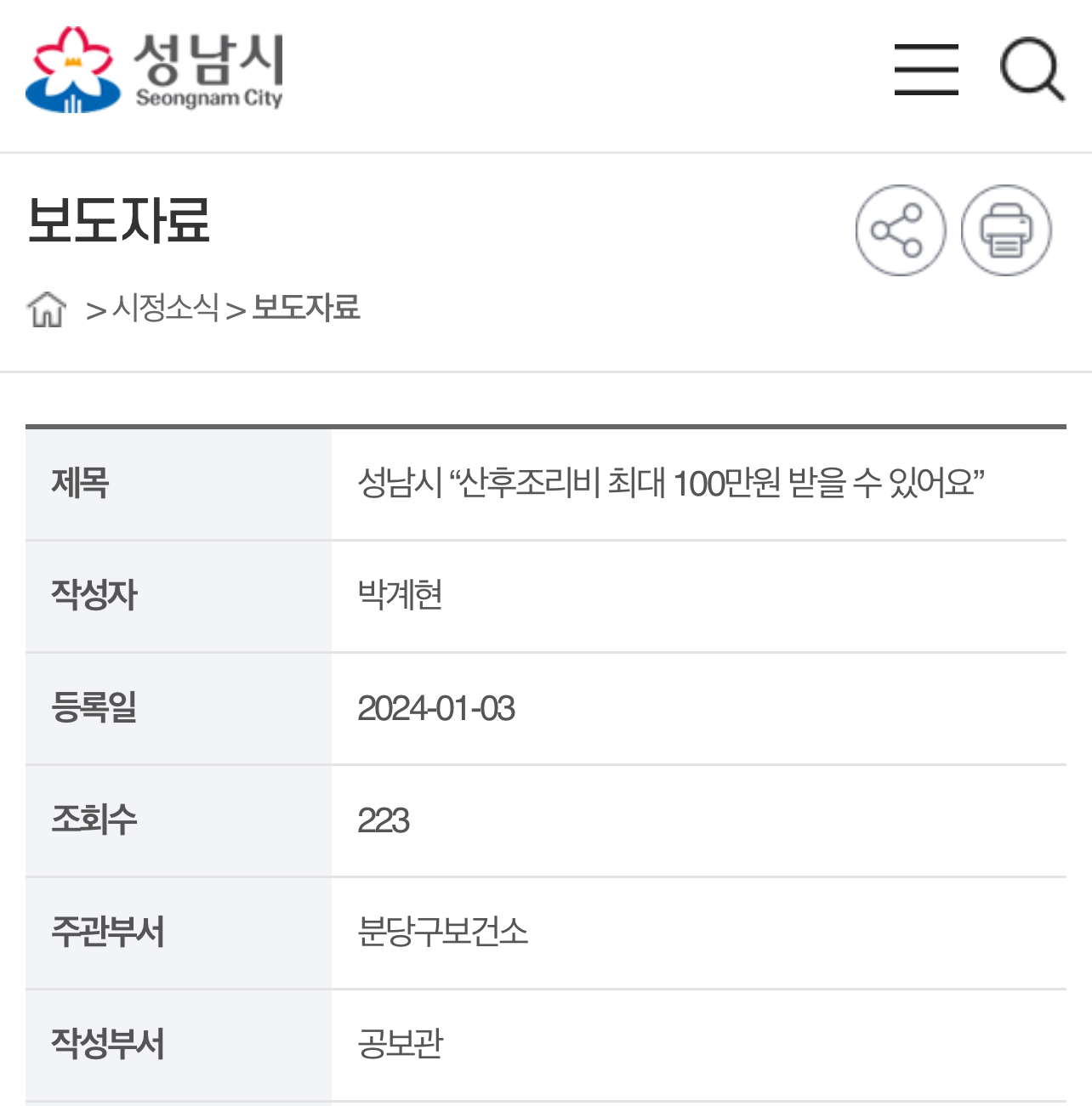 성남시 산후조리비 지원 대상자는 영아 출생 6개월 이내에 산모의 주소지 보건소를 방문해 산후조리비 신청서 등을 내면 됩니다