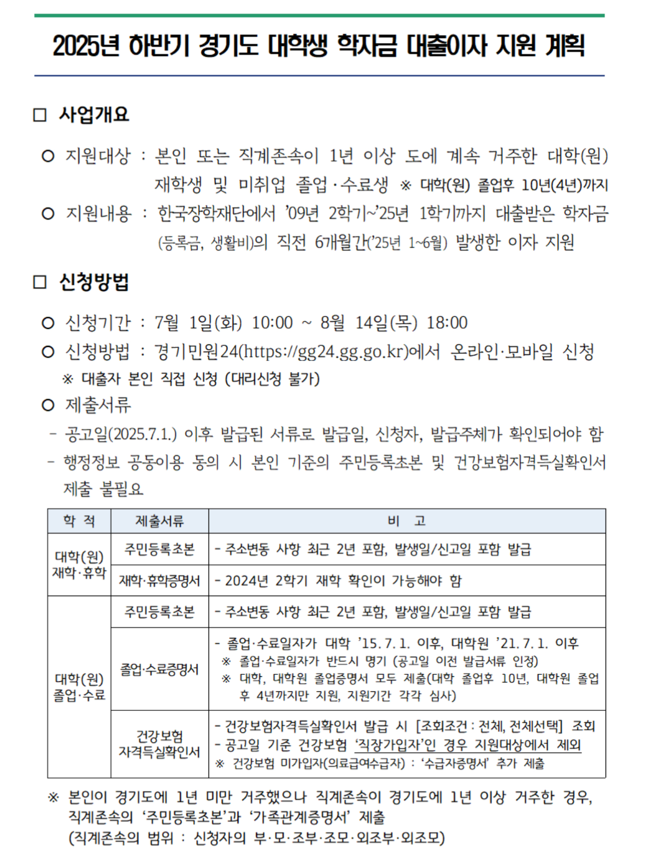 경기도는 오는 2025년 7월 1일부터 ‘2025년 하반기 경기도 대학생 학자금 대출이자 지원’ 신청자를 모집한다고 밝혔습니다.