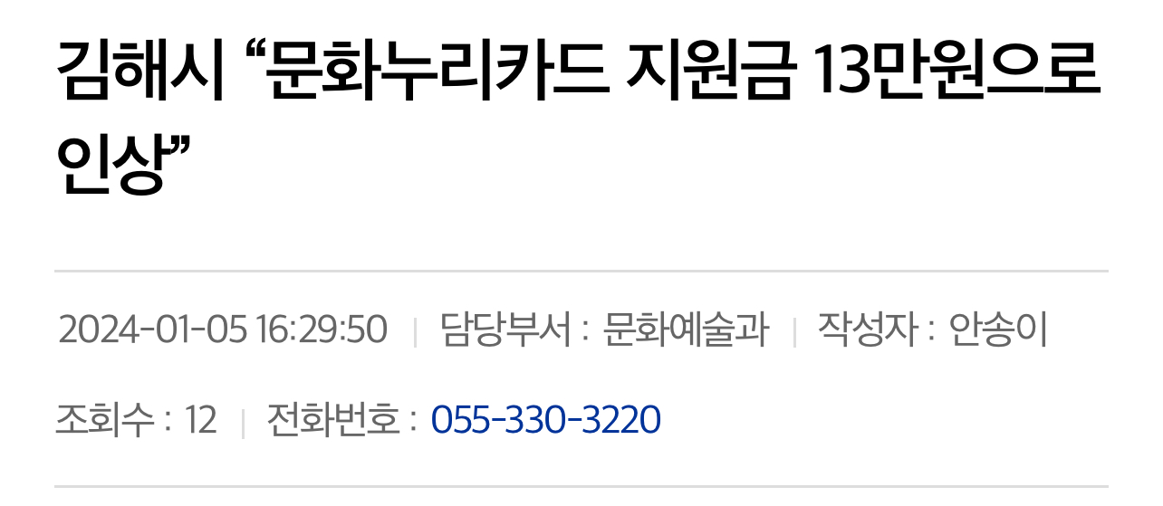 김해시(시장 홍태용)는 2024년부터 통합문화이용권(문화누리카드) 1인당 지급액이 기존 11만원에서 13만원으로 인상된다고 2024년 1월 5일에 밝혔습니다.