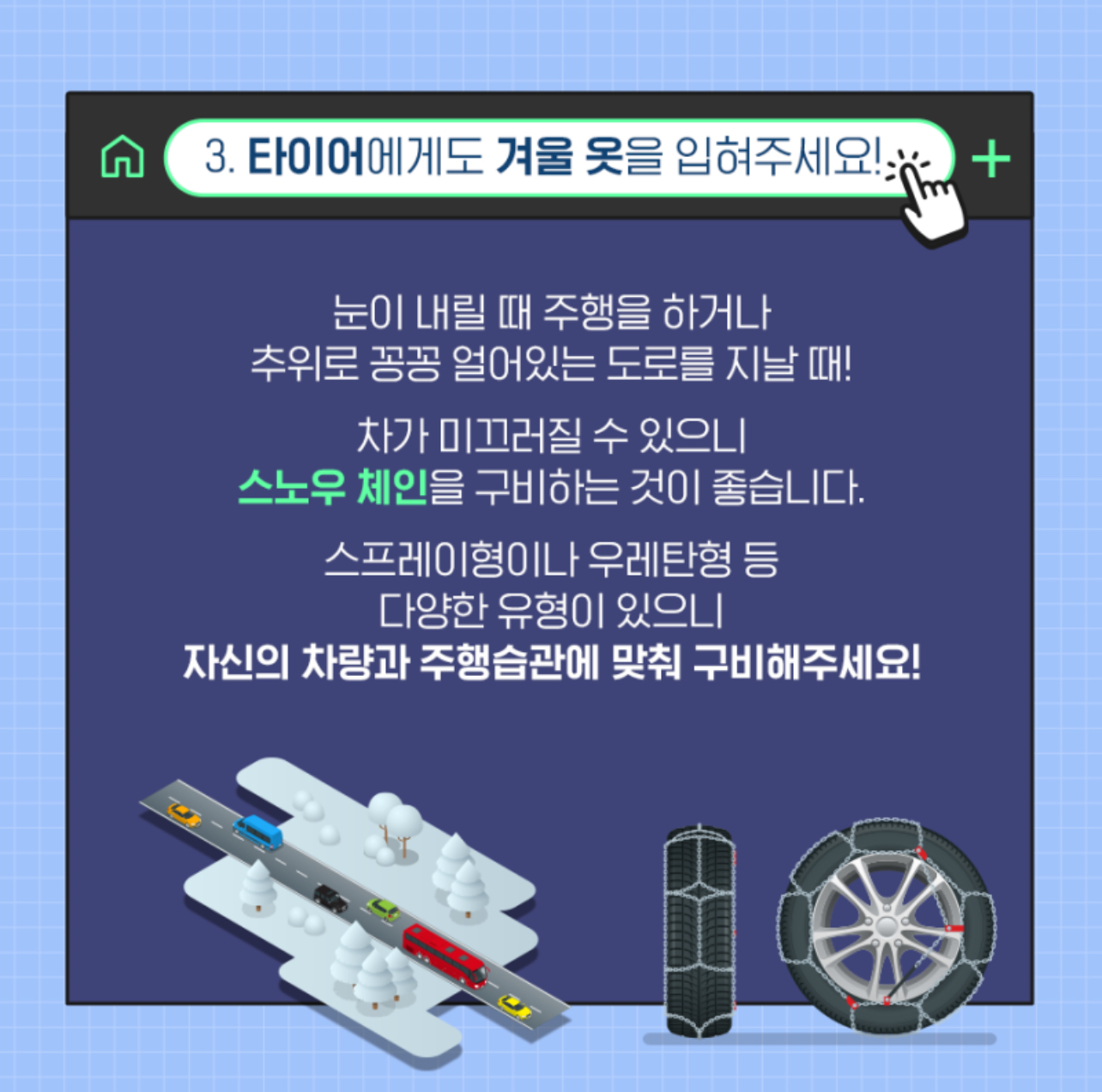 이렇게 겨울철 타이어 관리 3가지 방법만 알면 안전한 겨울철 운전을 이용하실 수 있습니다.
