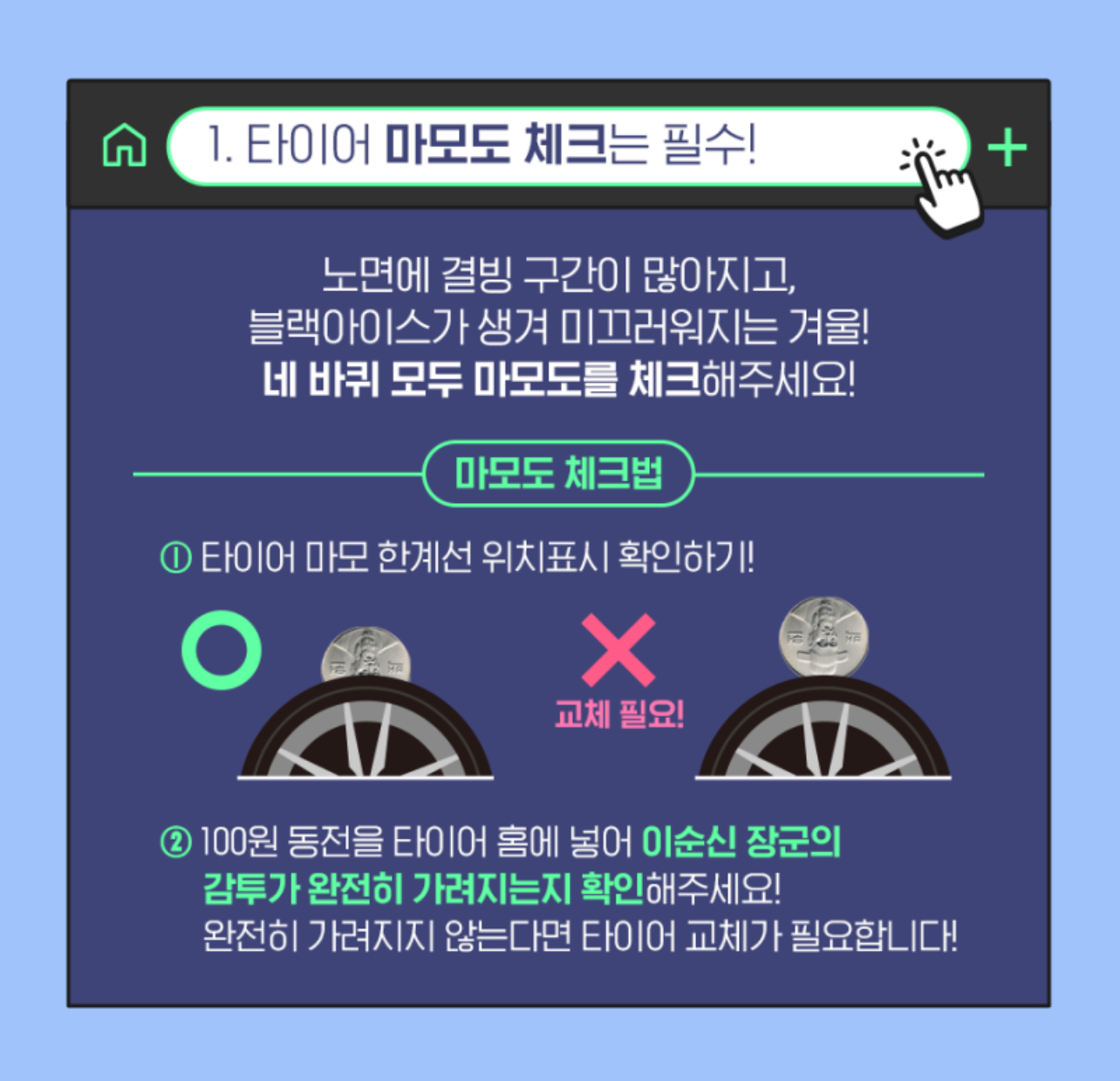 노면에 결빙 구간이 많아지고, 블랙아이스가 생겨 미끄러워지는 겨울에는 네 바퀴 모두 마모도를 체크해 주시길 바랍니다.
