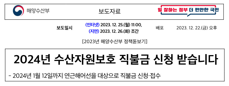 해양수산부(장관 조승환)는 2024년도 수산자원보호 직접지불금(이하 직불금) 신청을 2023년 12월 18일(월)부터 2024년 1월 12일(금)까지 받는다고 밝혔습니다.