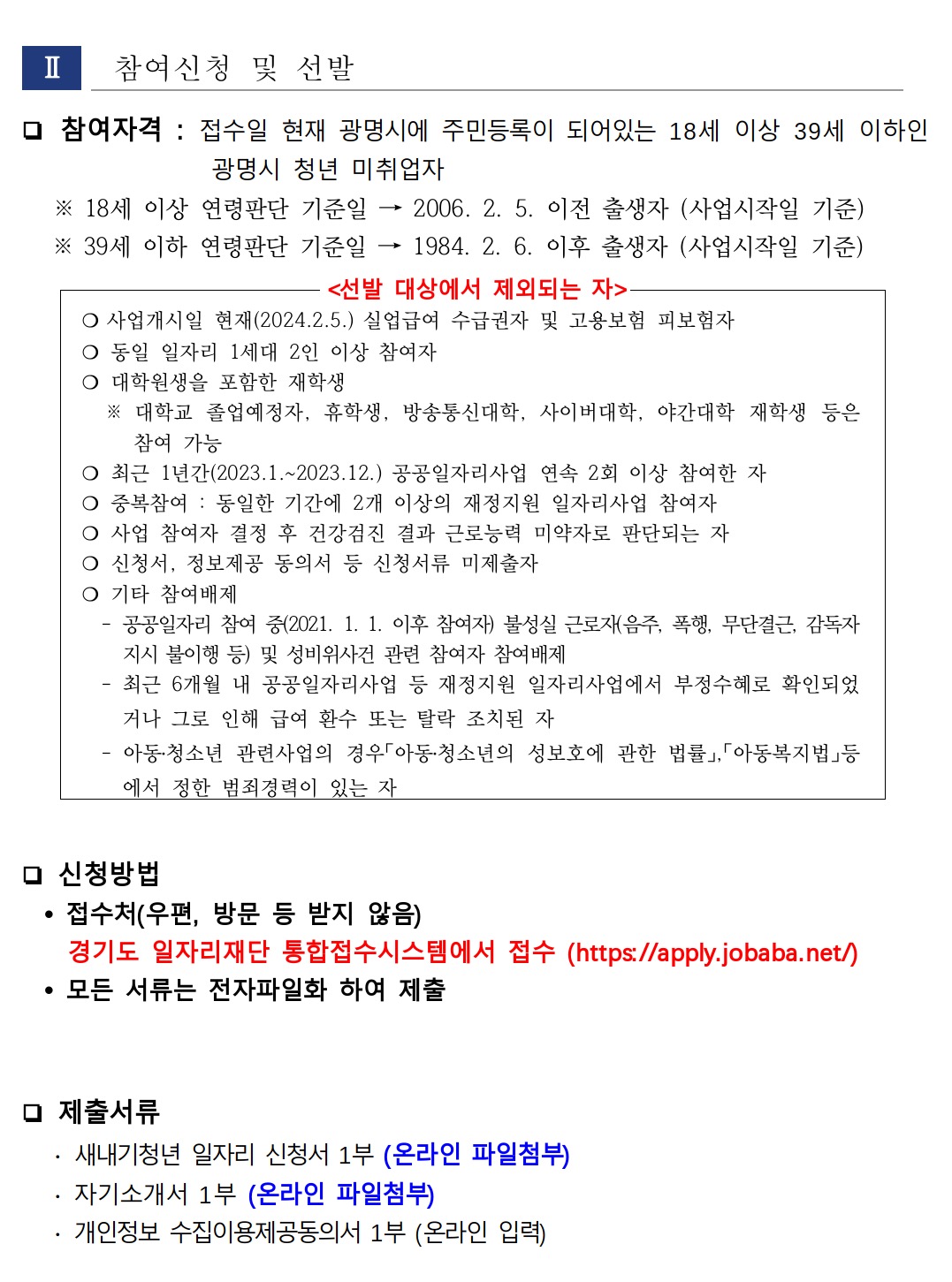 광명시 새내기청년 일자리 참여를 원하는 청년은 광명시청 누리집 고시 공고 및 채용 공고 모집 요강을 참고해 신청서 등 관련 서류를 신청 기간 내에 경기도일자리재단 통합접수시스템 '잡아바 어플라이'에 접수하면 됩니다.