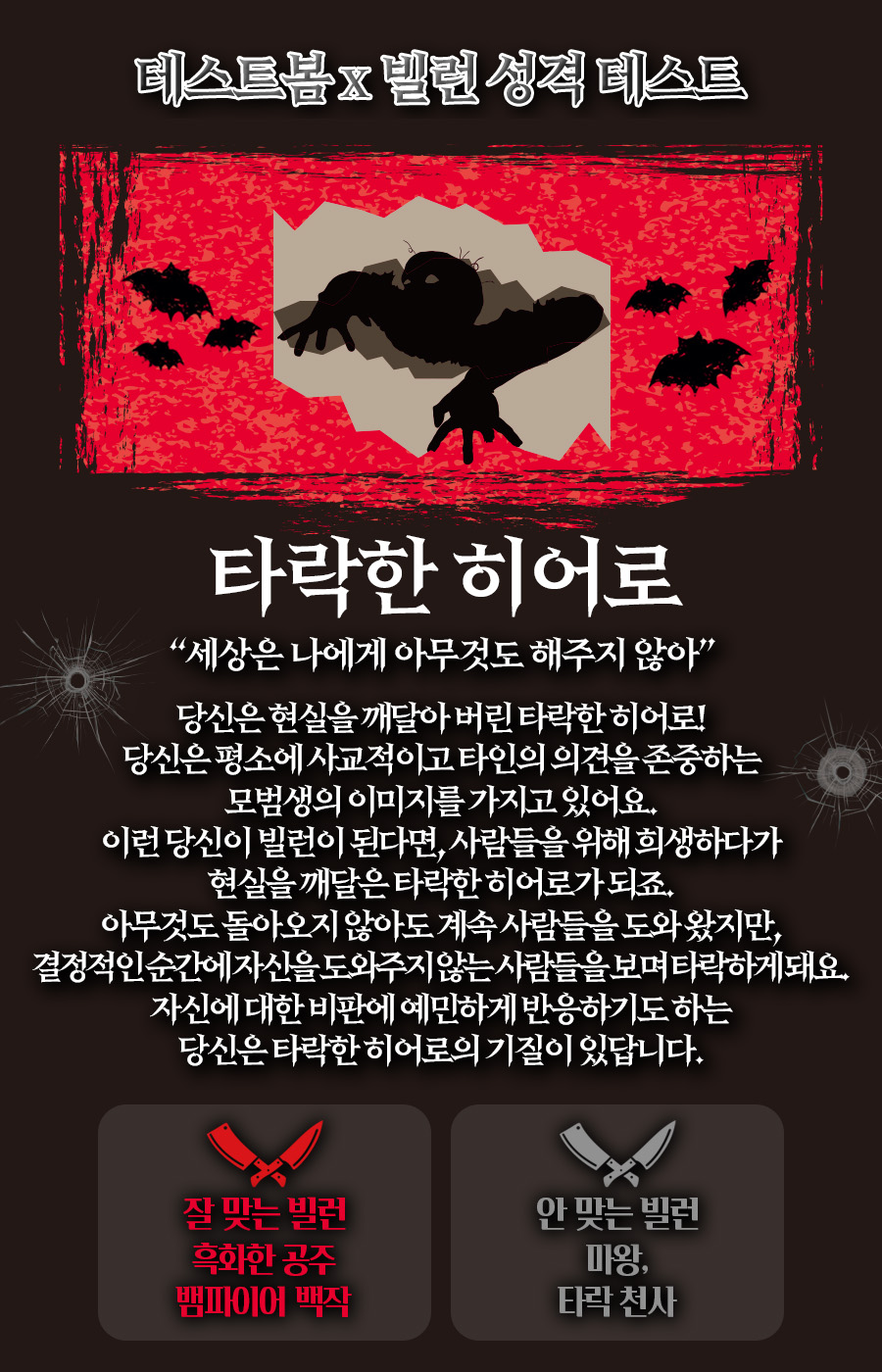 자신에대한 비판에 예민하게 반응하기도 하는 당신은 타락한 히어로의 기질이 있답니다.