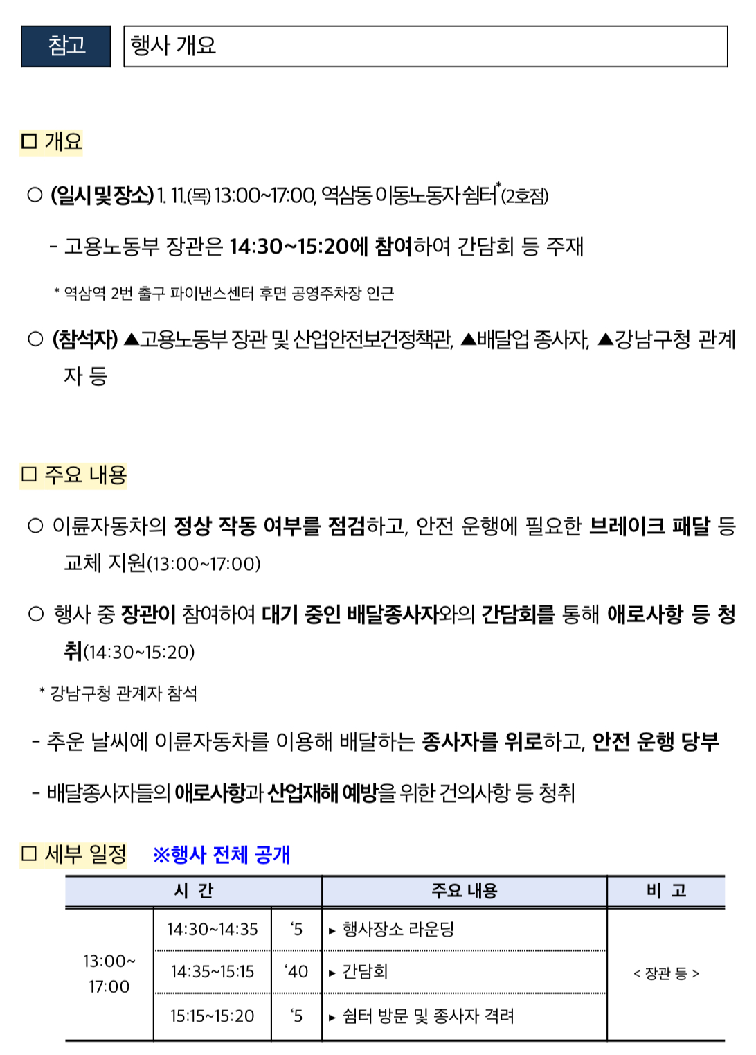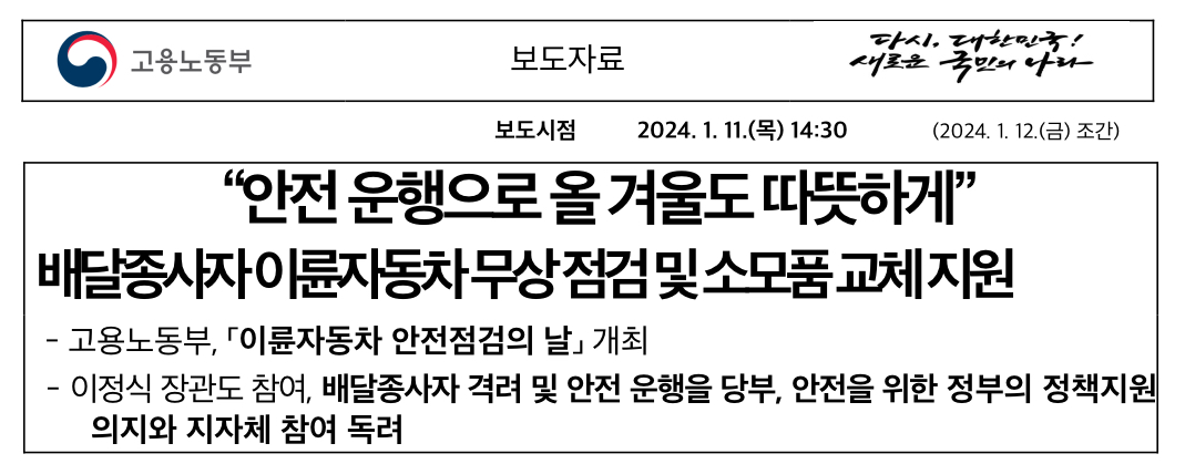 고용노동부(장관 이정식)와 산업안전보건공단(이사장 안종주)은 강남구, 한국오토바이정비협회와 협력하여 1.11.(목) 13:00~17:00, 겨울철 배달종사자들이 이륜자동차를 안심하고 운행할 수 있도록 정비를 지원하는 ‘이륜자동차 안전점검의 날’을 개최한다고 밝혔습니다.
