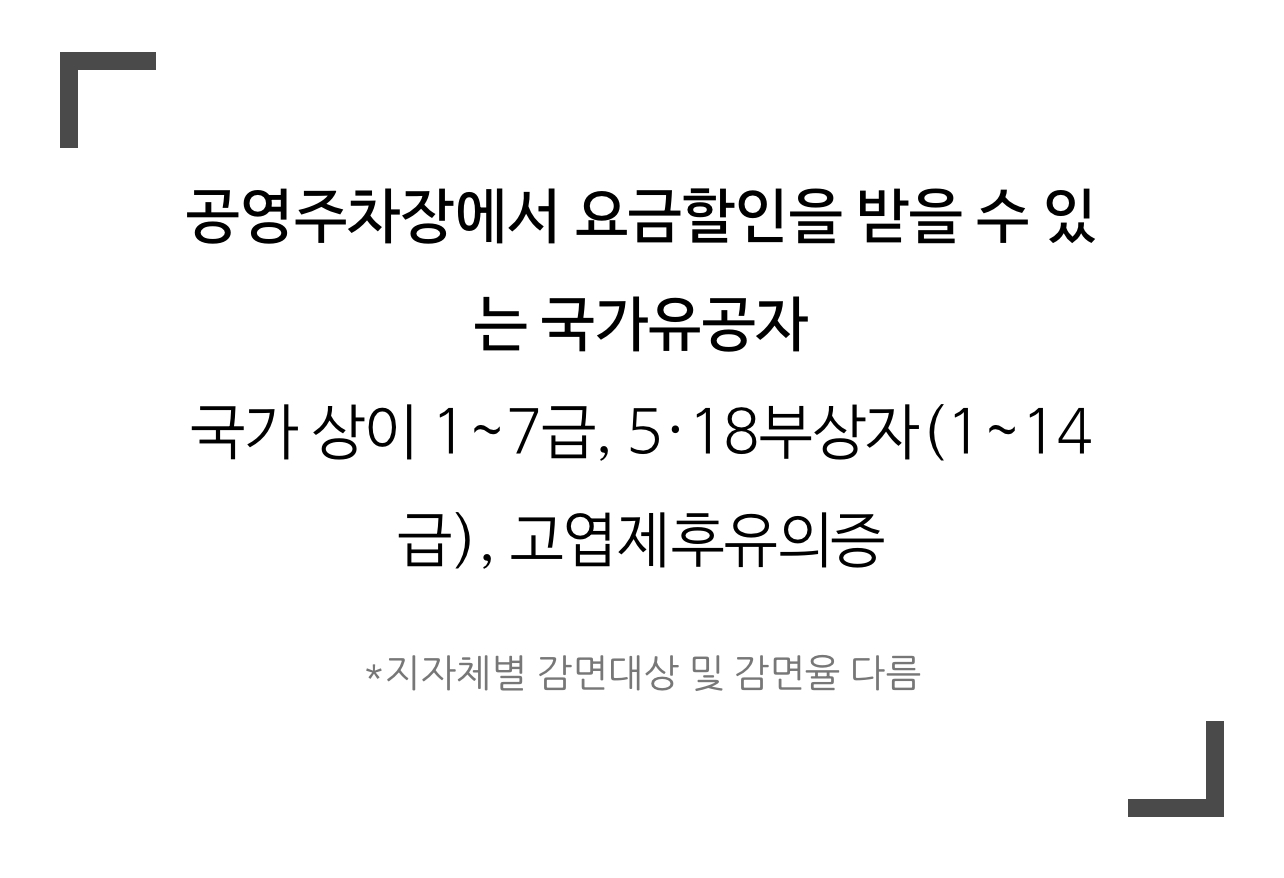 이때 증빙 자료(국가유공자증, 자동차표지 등)를 제시해야 하며 지자체별 공영주차장 요금 감면대상 및 감면율이 다르니 반드시 해당 지자체 홈페이지에서 감면대상자인지 확인하시기 바랍니다.
