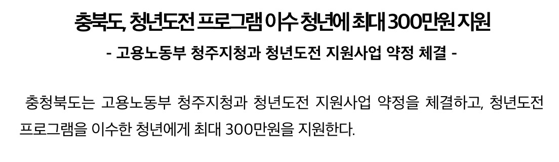 충청북도는 고용노동부 청주지청과 청년도전 지원사업 약정을 체결하고 청년도전 프로그램을 이수한 청년에게 최대 300만원을 지원한다고 밝혔습니다.