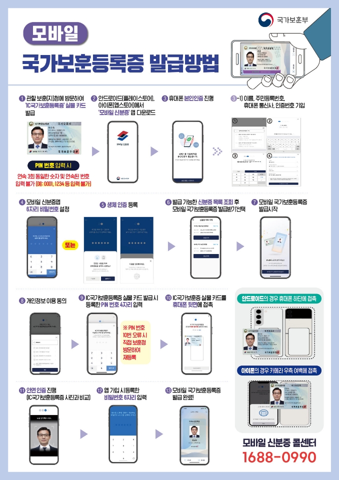 모바일 신분증 앱 다운로드 > 휴대폰 본인인증 및 비밀번호 설정 > 신분증 목록 조회 후 모바일 국가보훈등록증 발급받기 > 실물카드 발급 시 등록한 PIN 4자리 입력 > 실물카드 휴대폰 뒷면에 접촉 > 안면 인증 진행 > 발급 완료