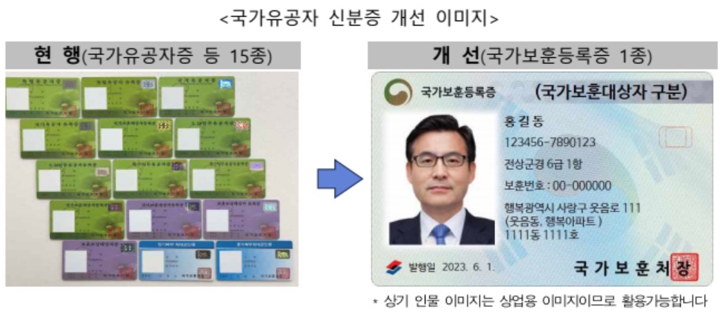 국가보훈부는 기존 국가유공자증, 독립유공자증, 특수임무유공자증, 5•18민주유공자증 등 보훈대상별로 15종으로 구분되어 있는 15종의 국가 유공자 신분증을 국가보훈등록증으로의 통합 계획을 밝힌 후 법령(국가 유공자법 등 7개 보훈관계 법률 시행령 및 시행규칙) 개정을 하고 2023년 6월 5일에 승격과 함께 전국 27개 보훈(지)청에서 발급을 시작했다고 합니다.