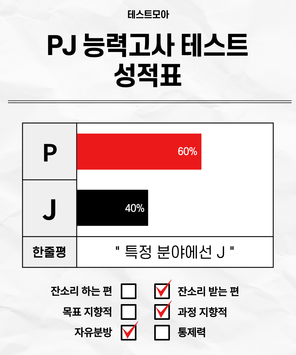 나는 P와 J중에서 어디가 더 가까운지 알아보는 테스트모아에서 나온 PJ 능력고사 테스트를 소개드리려고 합니다.