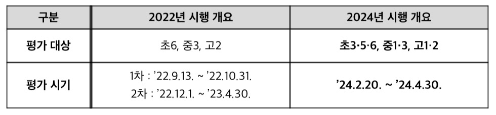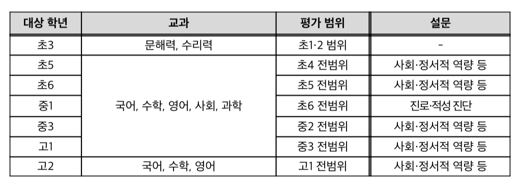 초5, 고1 평가를 신규 도입할 예정이었으나 초3, 중1 책임교육학년을 조기에 도입하여 총 7개 학년 학생의 학력을 진단할 수 있도록 하였으며 아울러, 향후 평가 대상을 확대하여 초3부터 고2까지 전 학년에 학력 진단을 지원할 계획이라고 합니다.
