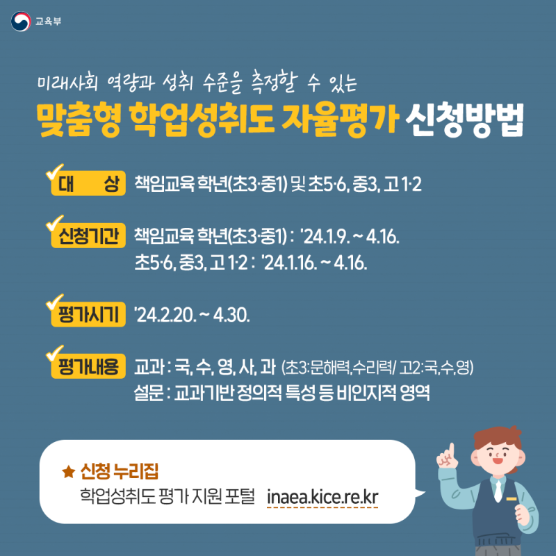 교육부(부총리 겸 교육부장관 이주호)와 한국교육과정평가원(원장 오승걸)은 학생 개개인의 학업 수준을 정확히 진단하기 위한 맞춤형 학업성취도 평가를 2024년 초에 시행한다고 합니다.