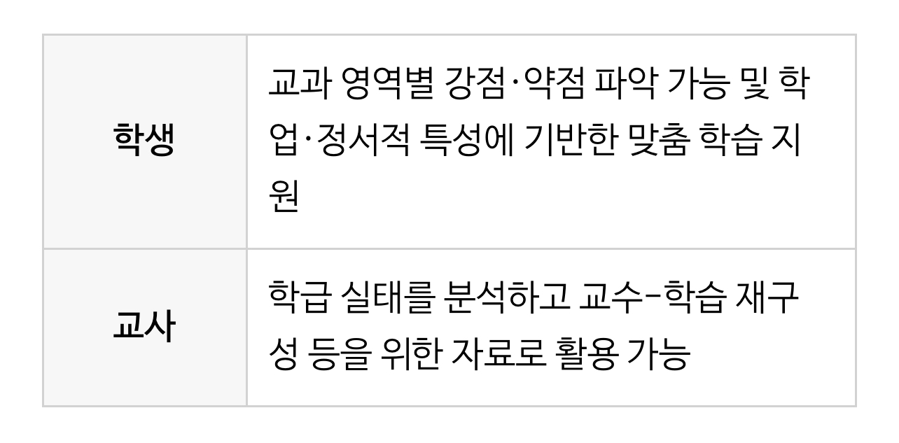 ➡️학생: 교과 영역별 강점·약점 파악 가능 및 학업·정서적 특성에 기반한 맞춤 학습 지원