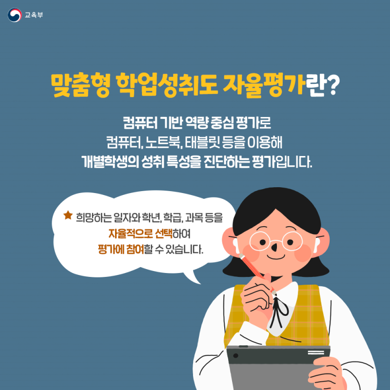 2022년에 도입된 맞춤형 학업성취도 자율평가는 학생들의 학업성취 수준을 파악하여 이를 교수‧학습에 활용하기 위한 컴퓨터 기반 평가라고 합니다.