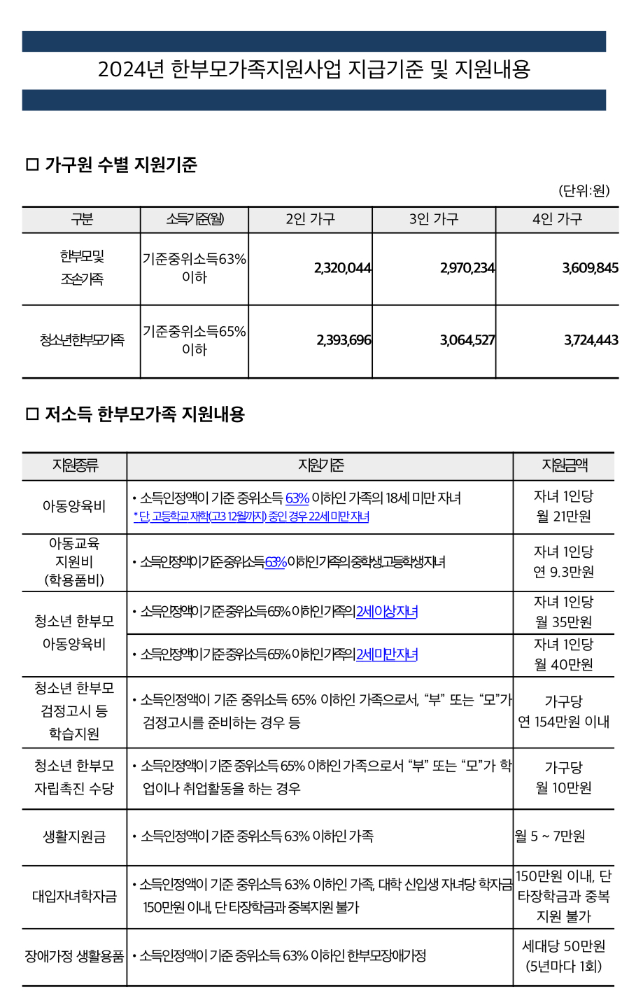 이에 따라 한부모가족 지원 대상이 기준중위소득 60%(2인 기준 221만 원) 이하에서 63%(2인 기준 232만 원) 이하로 완화된다고 합니다.