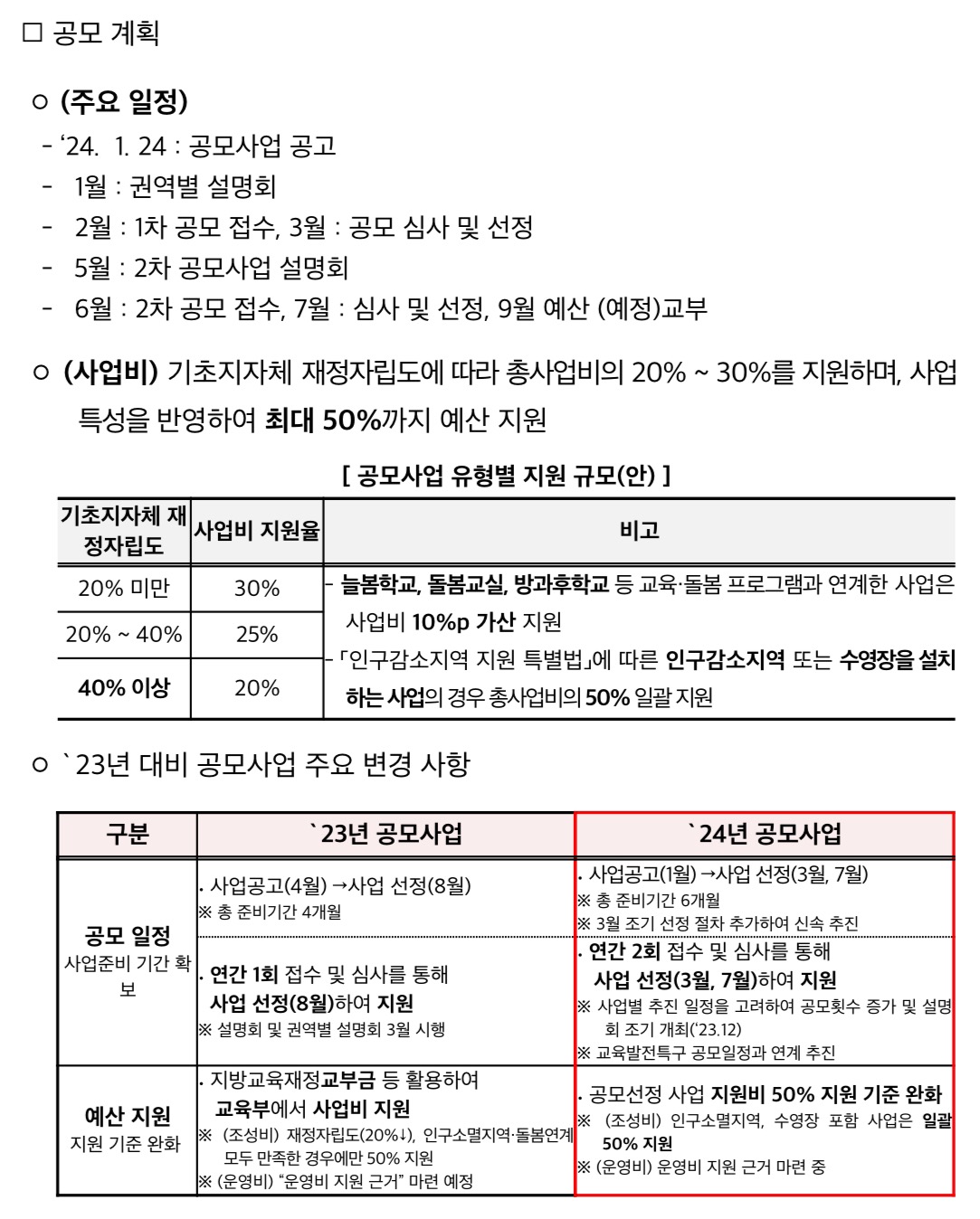 그간 교육부는 지자체의 재정자립도를 고려하여 학교복합시설 조성비를 차등 지원해 왔으나, 더 많은 지자체의 참여를 유도하기 위해 2024년에는 학교복합시설 사업에 참여하는 지자체에 대한 재정지원을 더욱 강화한다고 합니다.