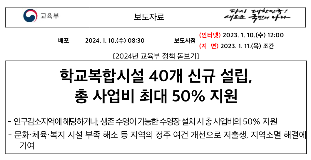 교육부는 학교복합시설을 설립하려는 지역이 ①인구감소지역에 해당하거나 ②학교복합시설 내 생존수영 등이 가능한 수영장을 설치하는 경우, 지자체의 재정자립도에 관계없이 총 사업비의 50%를 교육부에서 지원할 방침이라고 합니다.