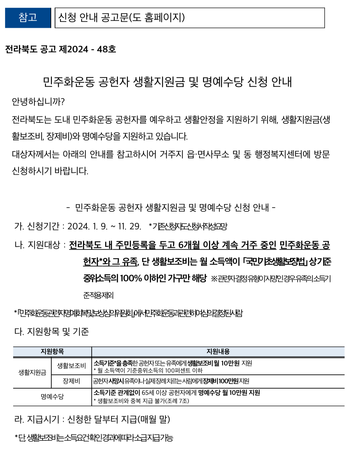 전북 민주화운동 공헌 생활지원금 및 명예수당 지급 대상자는 전라북도에 주민등록을 두고 6개월 이상 계속 거주하고 있는 민주화운동 공헌자(관련자) 또는 유족이며 단 생활보조비의 경우, ‘국민기초생활보장법’상 월 소득액이 중위소득 100% 이하 가구에만 지급됩니다.