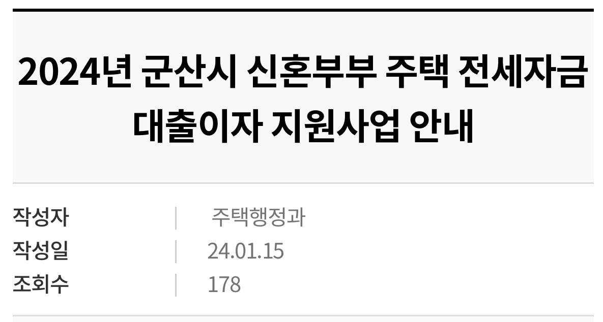 군산시는 무주택 신혼부부의 주거마련 비용 부담 완화를 위해 전세자금 대출이자를 지원하고자 다음과 같이 공고한다고 밝혔습니다.