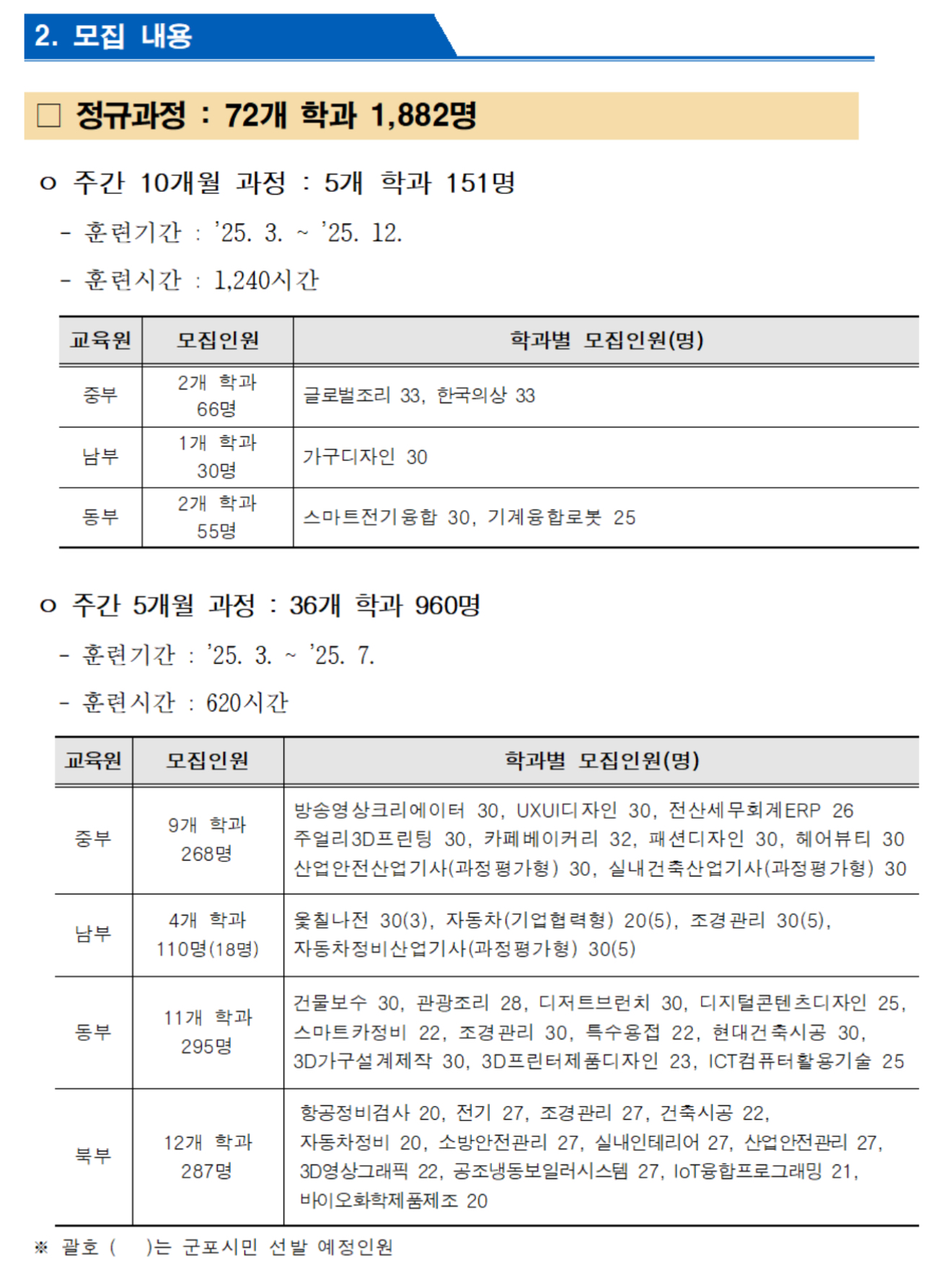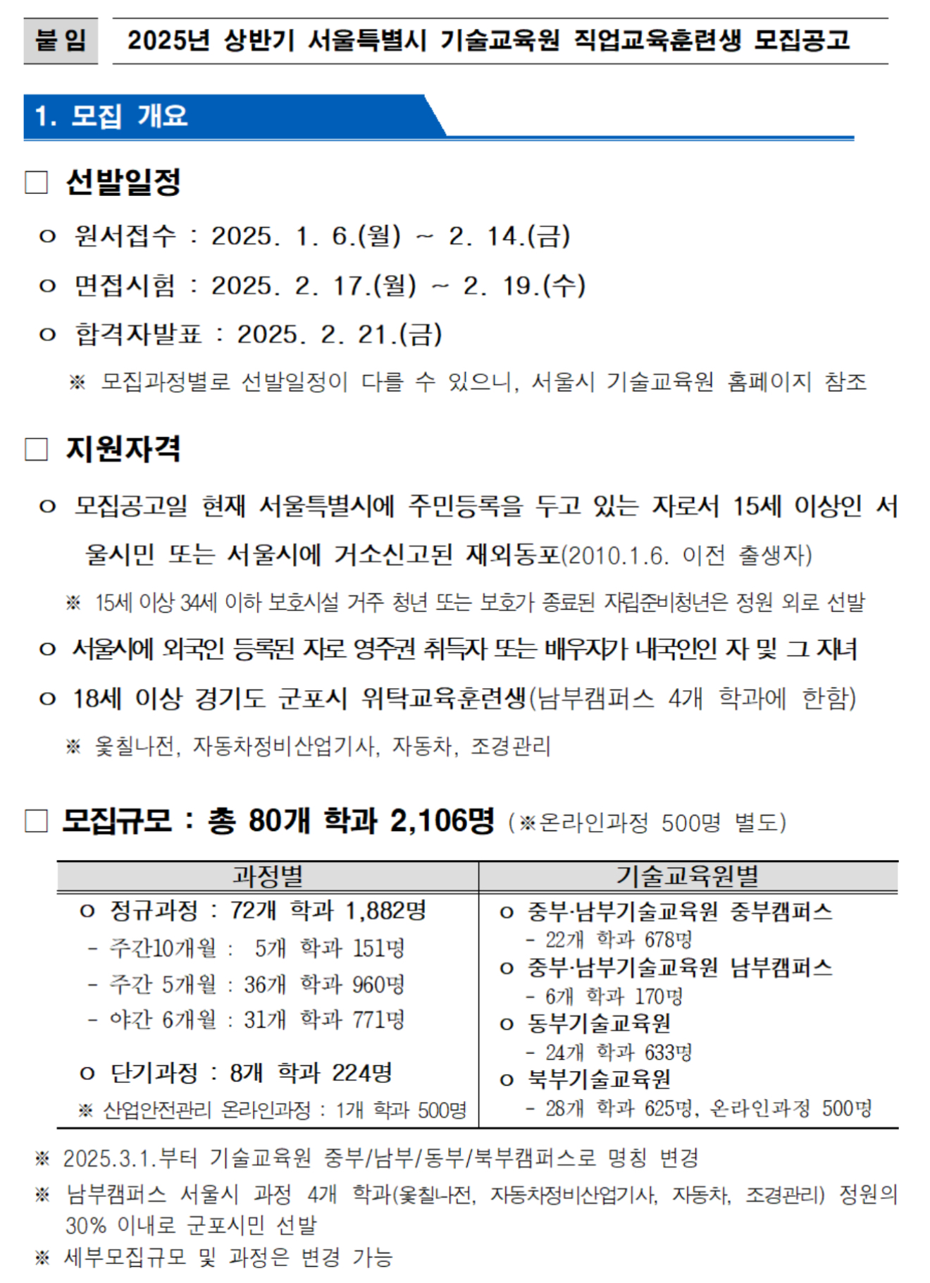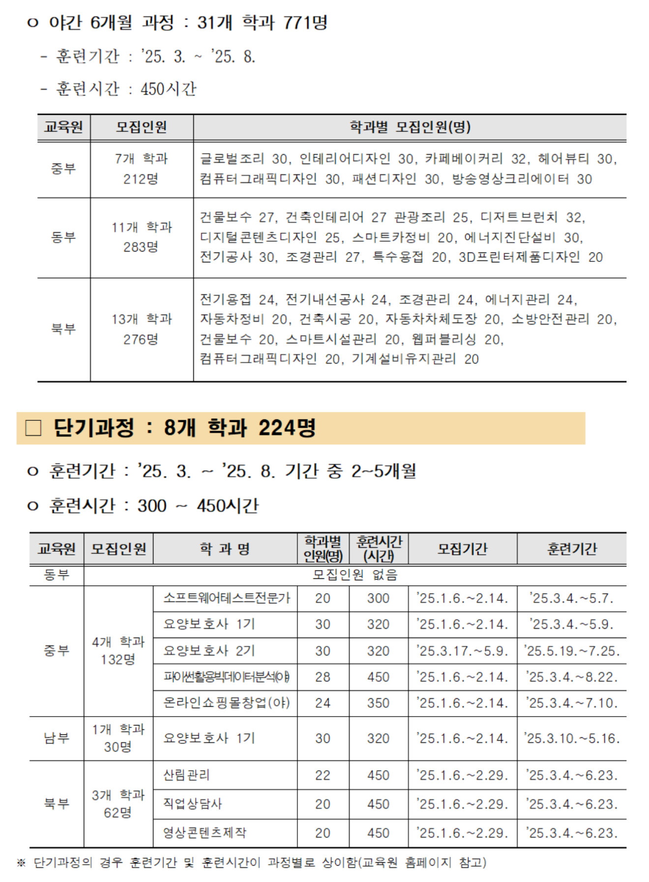 이번 상반기 모집인원은 ▴정규과정(주간5/10개월, 야간6개월) 72개 학과 1,882명 ▴단기과정 8개 학과 224명 등 총 80개 학과에서 2,106명이라고 합니다.