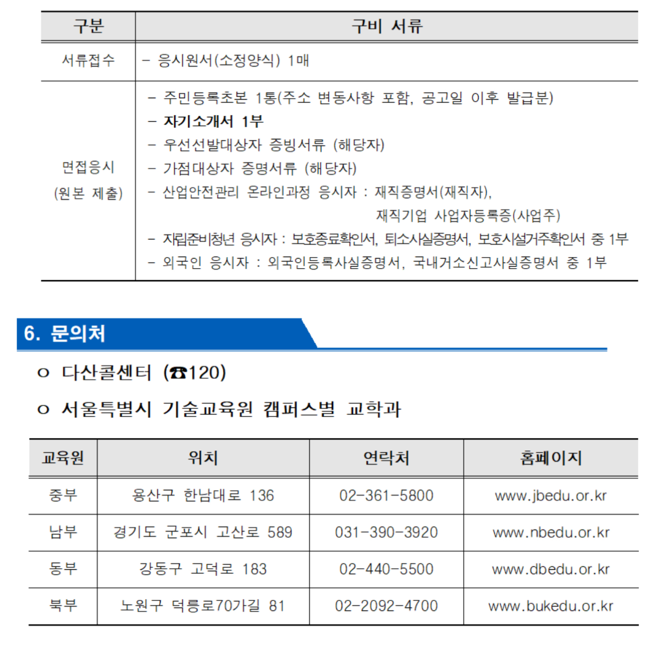 - 북부 기술교육원(노원구 덕릉로70가길 81) : 02-2092-4700, ☞ https://www.bukedu.or.kr/)