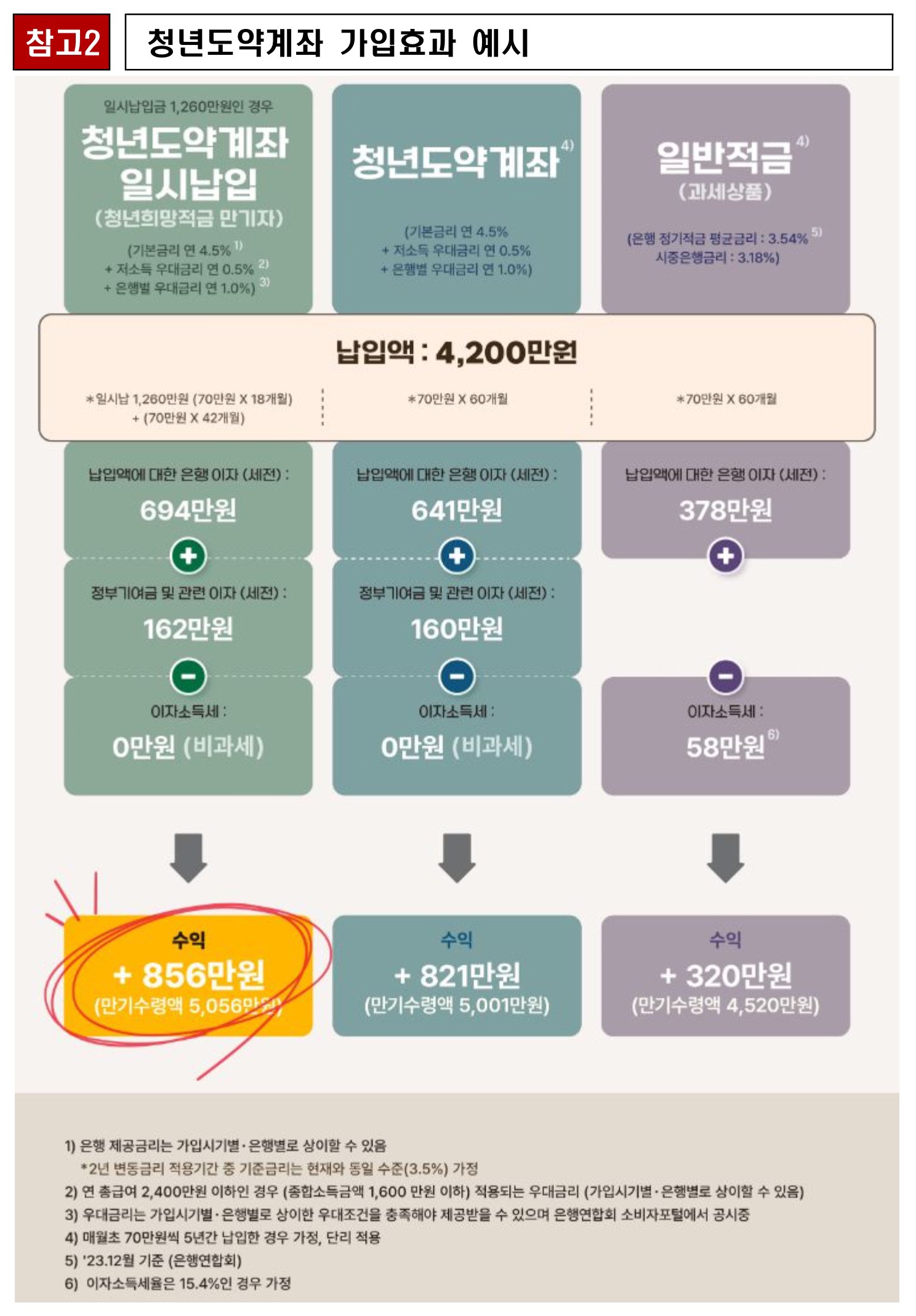 금융위원회는 청년도약계좌 일시납입(일시납입금 1260만원, 월 설정금액 70만원, 일시납입금 전환기간 종료 후 매월 70만원 신규납입, 금리 6% 가정)시 만기에 얻을 수 있는 수익은 최대 약 856만원으로, 일반적금상품의 기대 수익 약 320만원 대비 2.67배 수준이라고 설명했습니다.