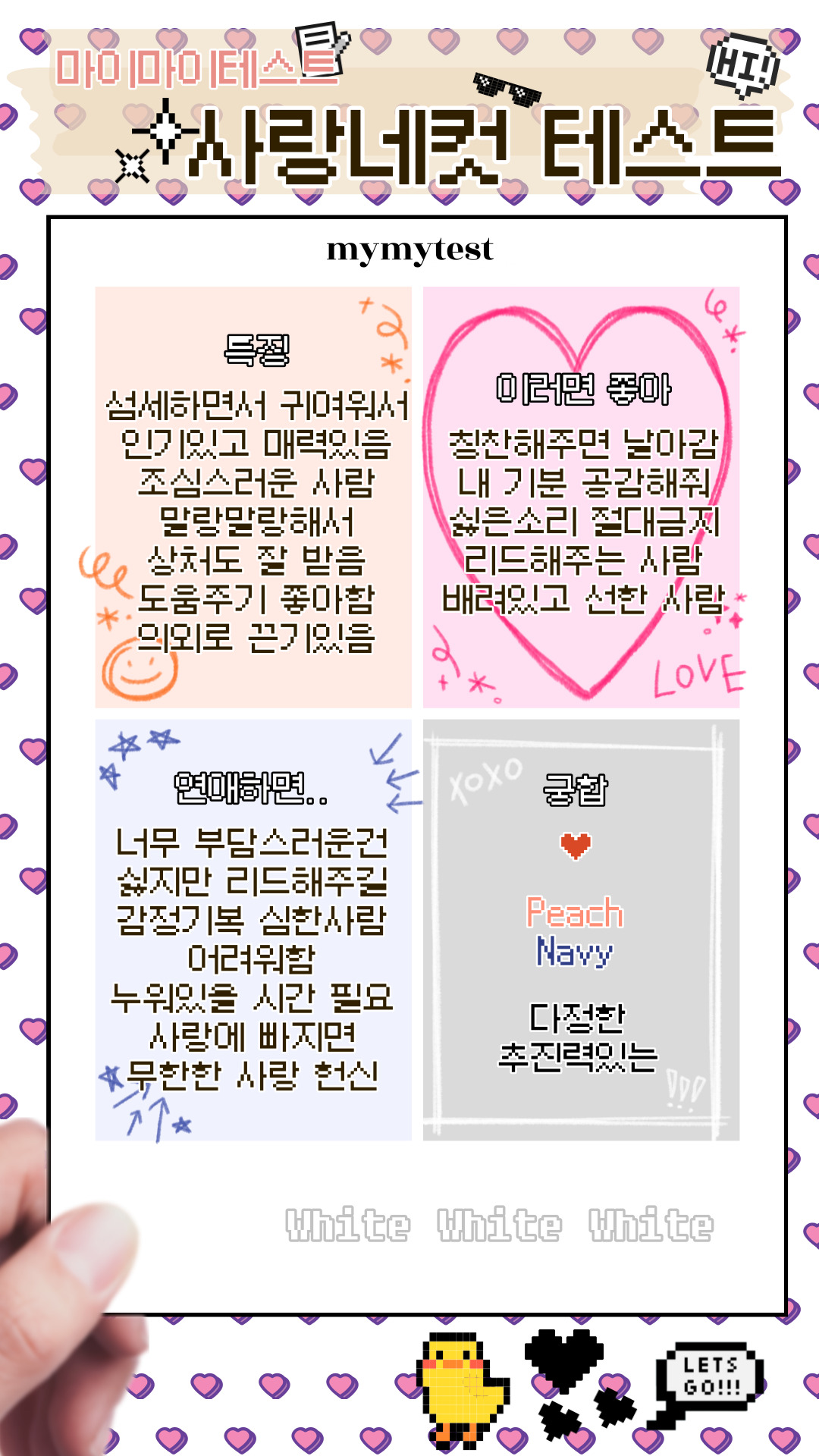 마이마이테스트라는 사이트에서 내 사랑의 특징과 연애하면 어떨지를 네컷사진으로 알려주는 사랑네컷 테스트가 등장했는데 소개와 더불어 mbti 유향 모든 결과까지 공개해 드리겠습니다.