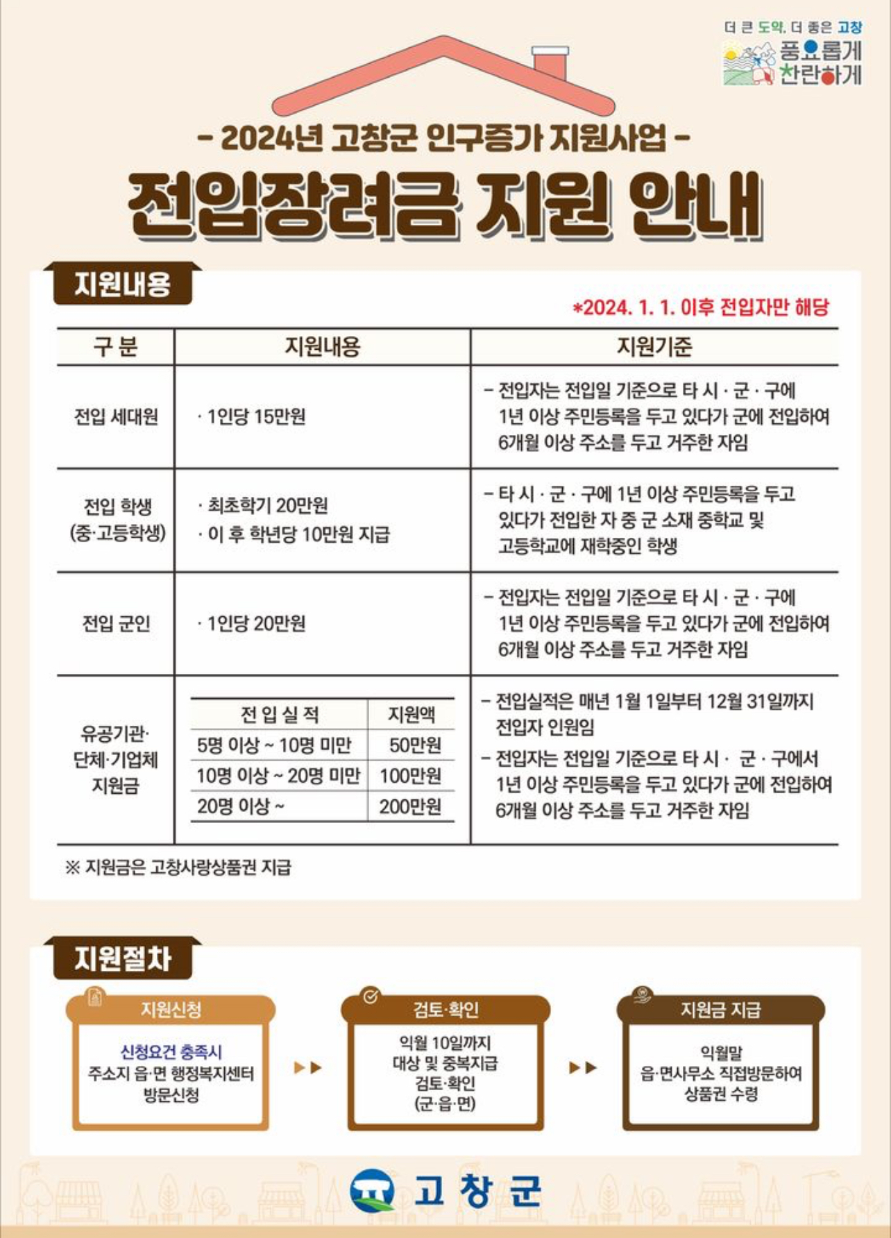 고창군 전입신고 지원금 지원 대상은 올해 2024년 1월 1일 이후 전입한 군민으로 전입 세대원, 전입 중·고등학생, 전입군인, 전입 유공기관·단체·기업체 등입니다.