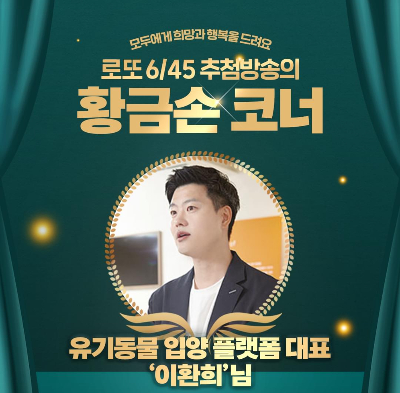 MBC '생방송 행복드림 로또 6/45' 1103회 '황금손'으로 유기동물 입양 플랫폼 ‘포인핸드’ 이환희 대표가 출연한다고 합니다.