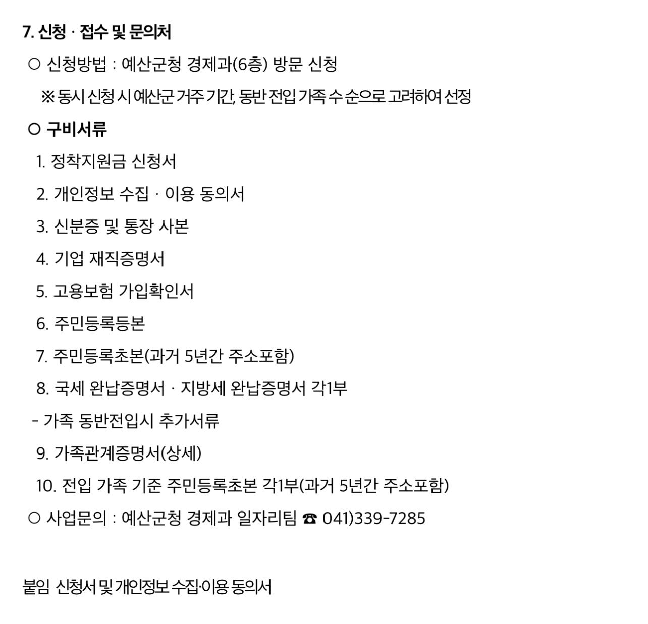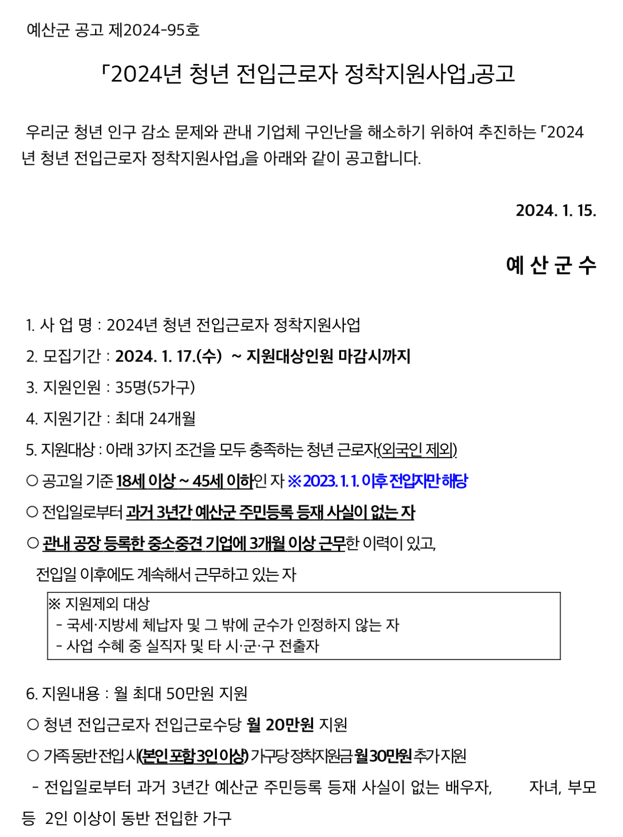 예산군 청년 전입 근로자 정착지원금 신청 기간은 2024년 1월 17일부터이며 지원 대상은 2023년 1월 1일 이후 전입 신고한 18세 이상 45세 이하 청년 중 관내 공장 등록한 중소·중견기업에 3개월 이상 근무한 사람이고 과거 3년간 예산군에 주민등록 등재 사실이 없어야 합니다.