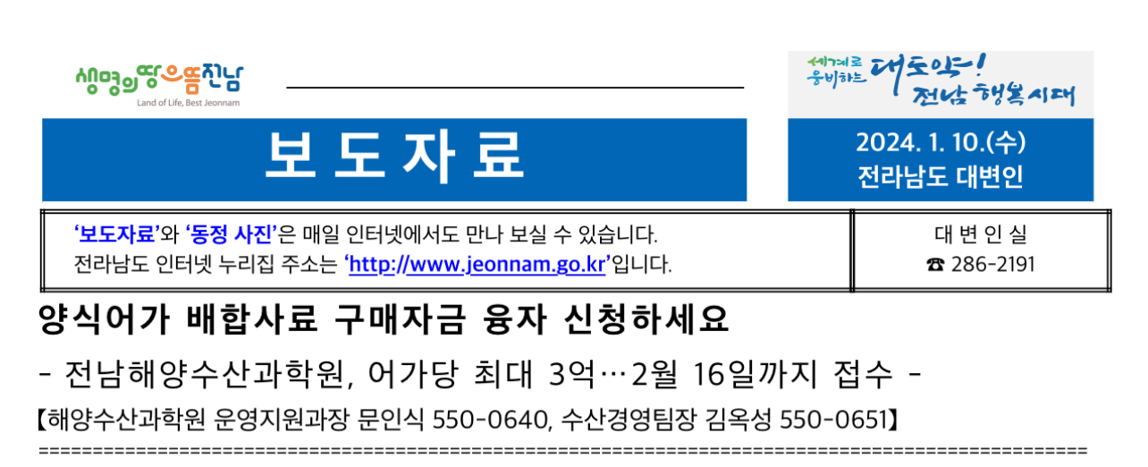 전남 양식어가 배합사료 구매자금 융자 신청 사업 희망자는 사업신청서, 신용조사서, 배합사료 구매 계획서, 양식어업 면허·허가·신고증, 어업경영체 등록확인서 등을 갖춰 사업장 주소지 관할 전남해양수산과학원 각 지원에 방문해 신청하면 됩니다.