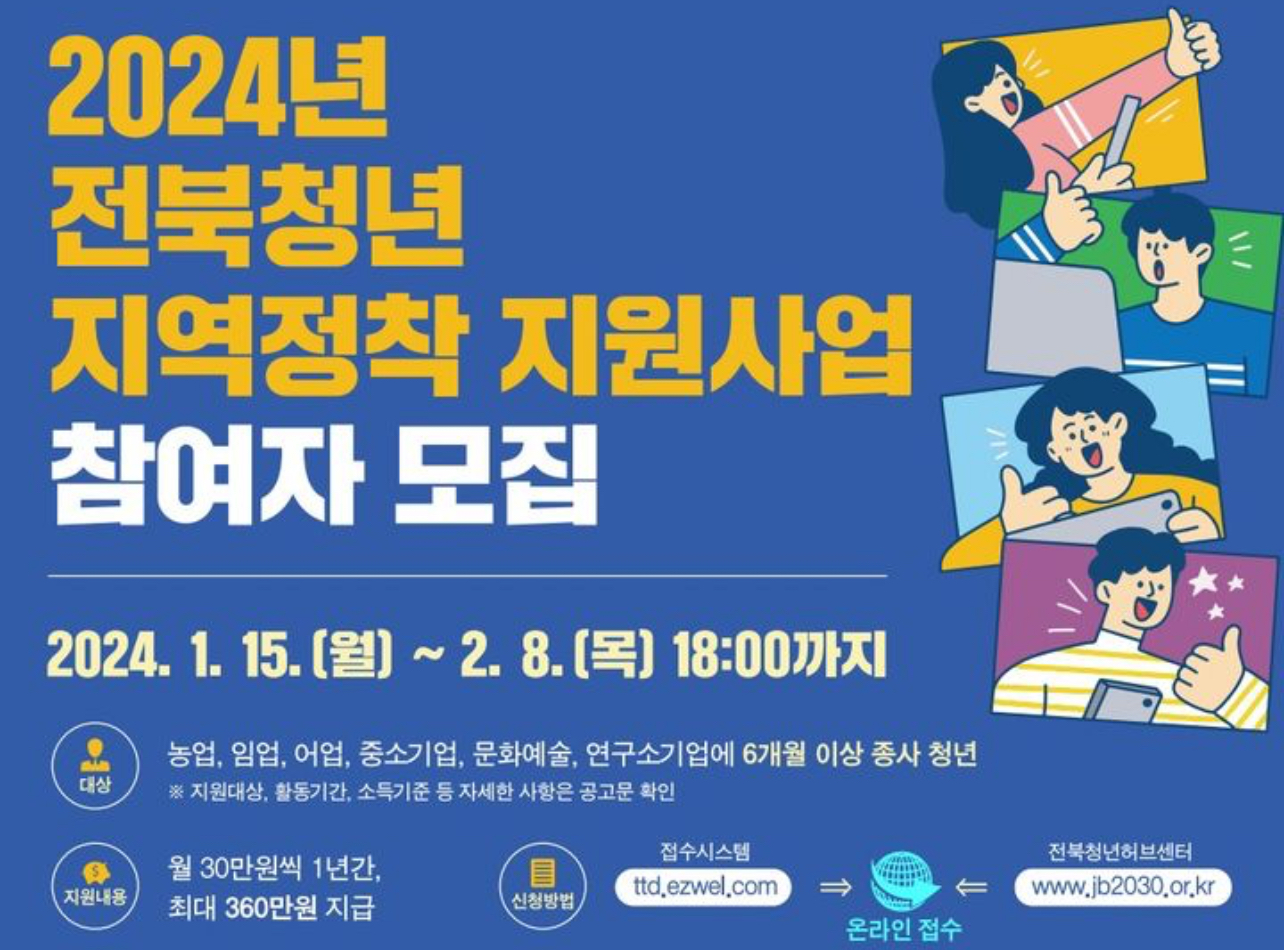 전북 고창군이 지역 산업에 종사하는 청년의 경제적 자립과 안정적인 지역정착을 돕기 위해 전북형 청년수당인 ‘전북청년 지역정착 지원사업’ 참여자를 모집한다고 2024년 1월 19일에 밝혔습니다.