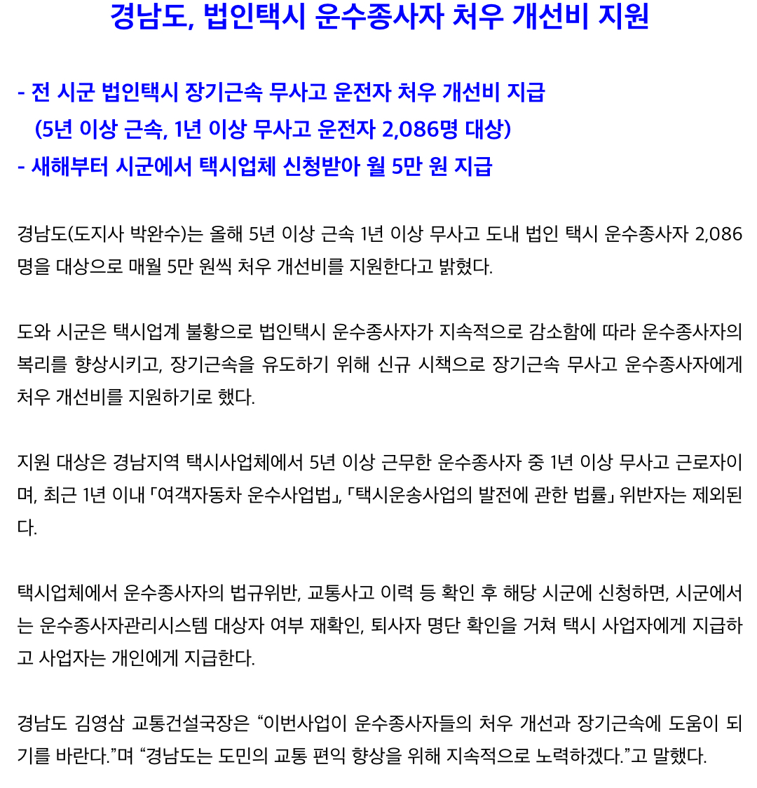 경남도(도지사 박완수)는 올해 5년 이상 근속 1년 이상 무사고 도내 법인 택시 운수종사자 2,086명을 대상으로 매월 5만 원씩 처우 개선비를 지원한다고 밝혔습니다.