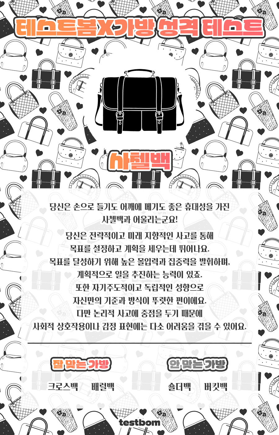 테스트봄에서 나온 가방 성격 테스트를 통해서 어떤 가방이 나올지 알아보시길 바랍니다.
