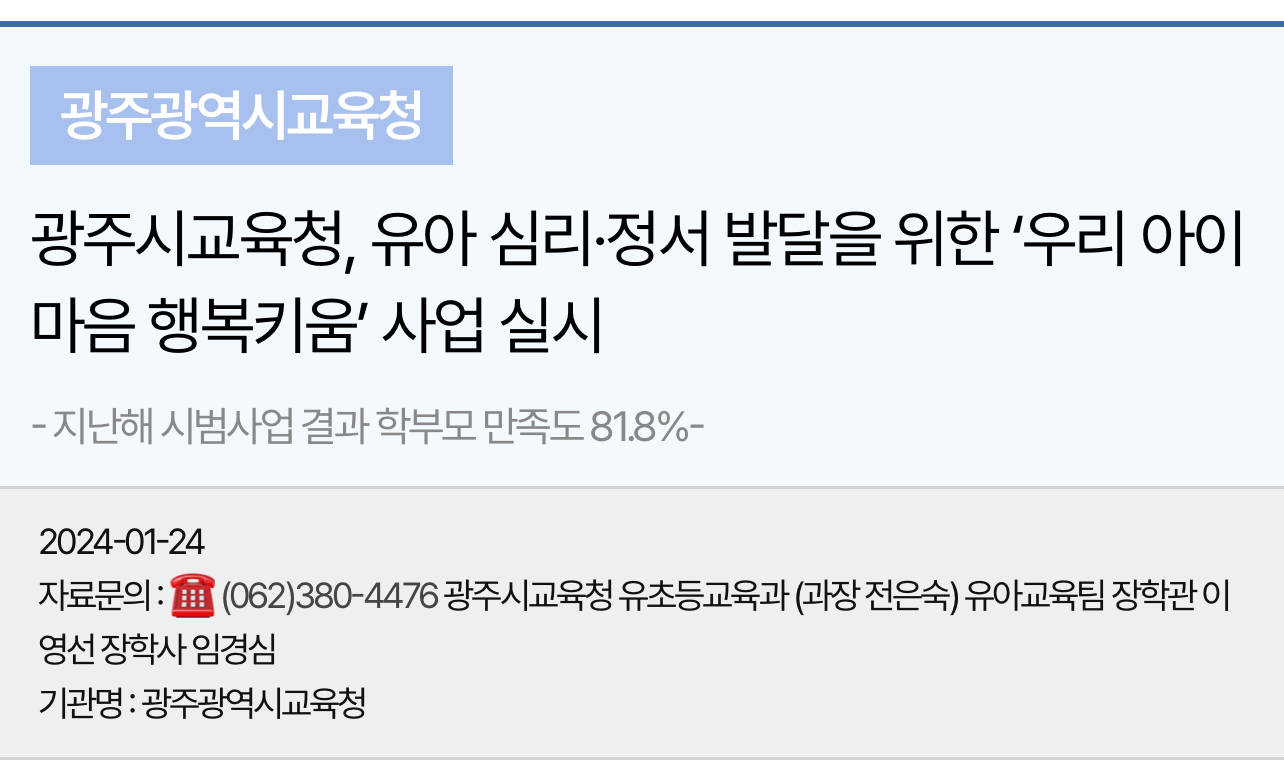 이후 광주광역시유아교육진흥원과 함께 1인당 4회의 상담이 이뤄져 유아의 건강한 심리·정서 발달을 도왔다고 합니다.
