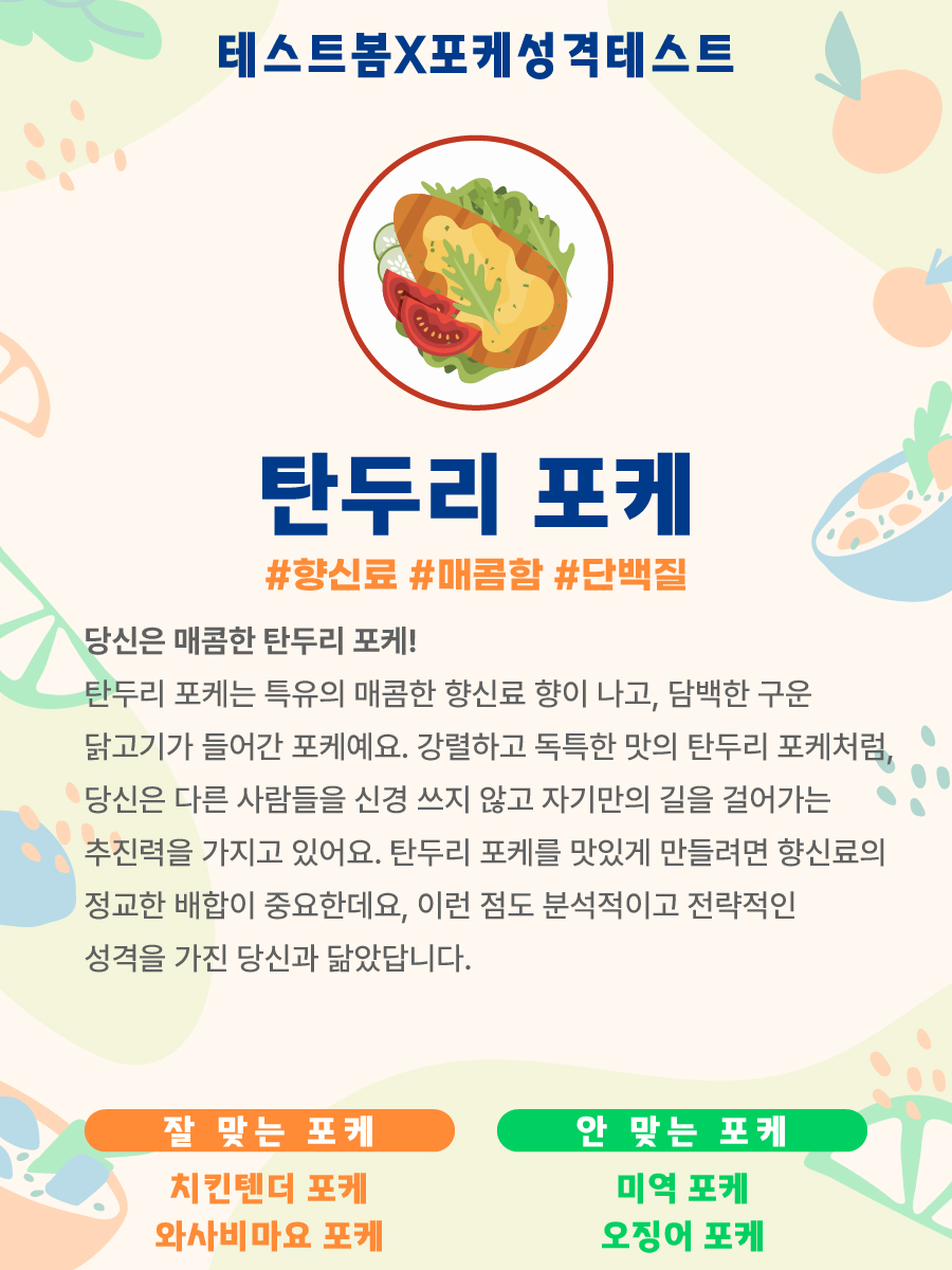 강렬하고 독특한 맛의 탄두리 포케처럼, 당신은 다른 사람들을 신경 쓰지 않고 자기만의 길을 걸어가는 추진력을 가지고 있어요.