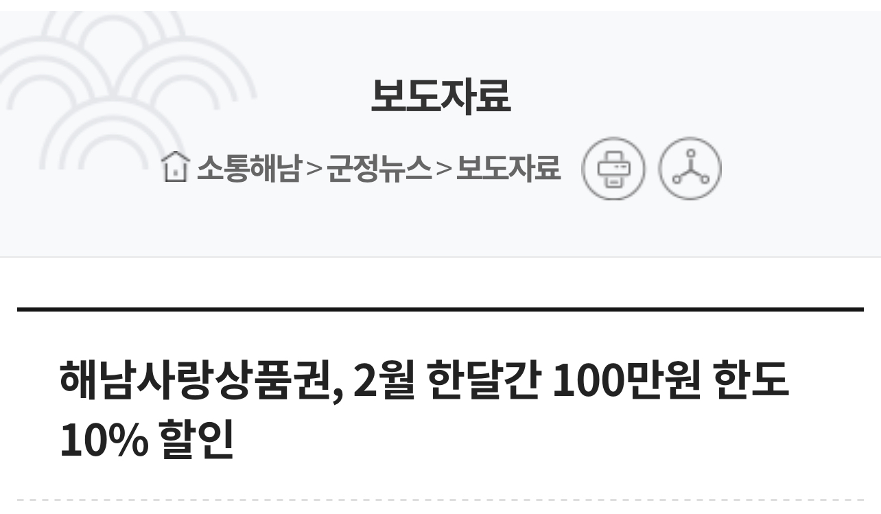 해남군은 2024년 2월 한 달간 해남사랑상품권을 10% 할인 판매한다는데 특히 구매 한도액을 당초 50만원에서 100만원까지 상향했다고 합니다.
