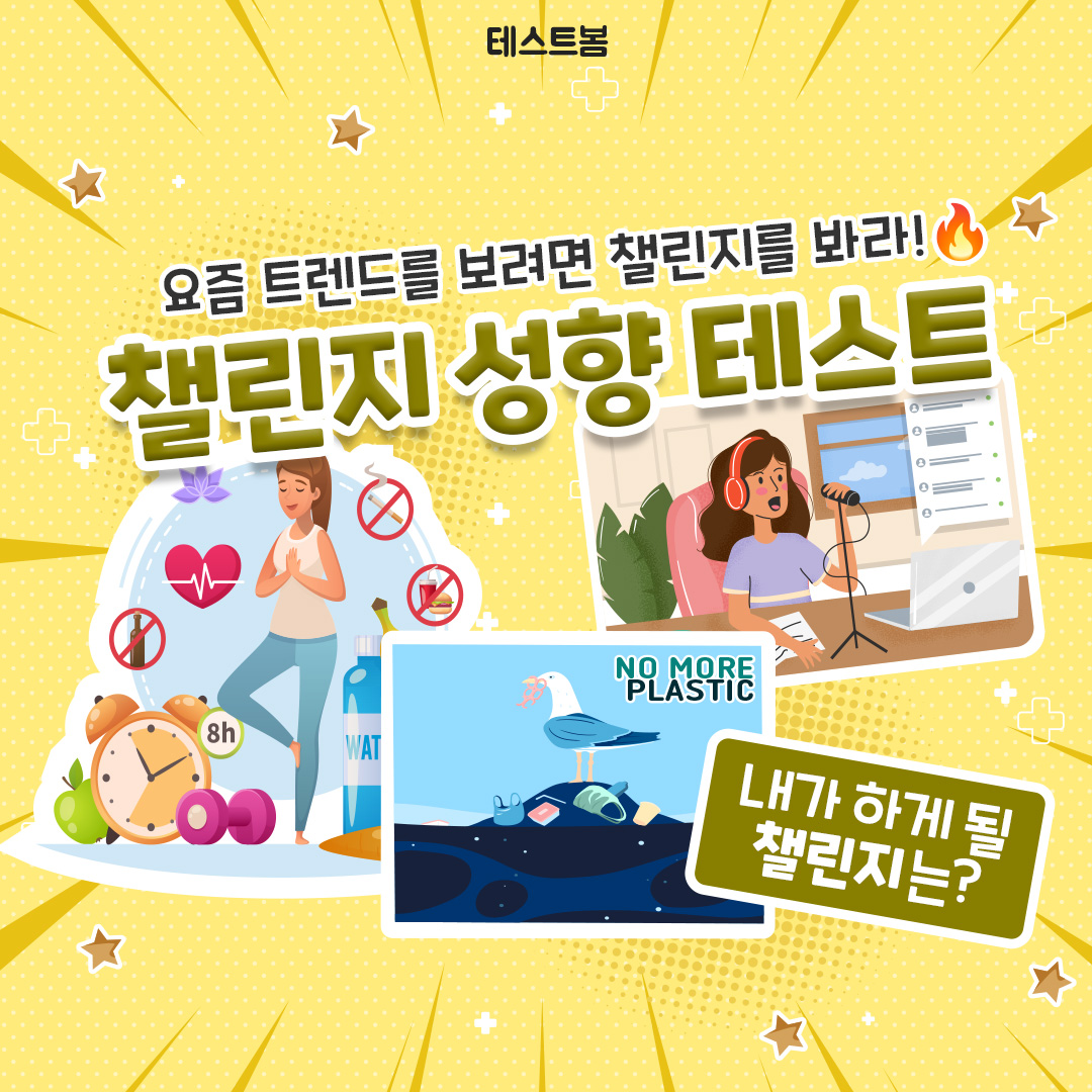 유행하는 수많은 챌린지 중, 나의 성향과 잘 맞는 챌린지는 무엇일지 알아볼수있는 테스트봄에서 나온 챌린지 성향 테스트를 소개드리겠습니다.