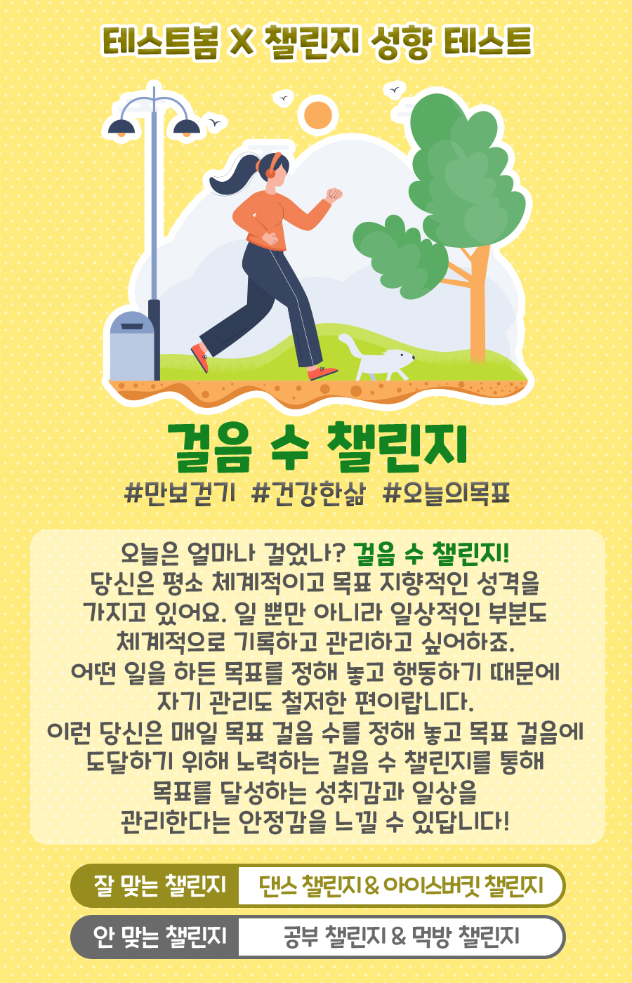 이런 당신은 매일 목표 걸음 수를 정해 놓고 목표 걸음에 도달하기 위해 노력하는 걸음 수 챌린지를 통해 목표를 달성하는 성취감과 일상을 관리한다는 안정감을 느낄 수 있답니다!