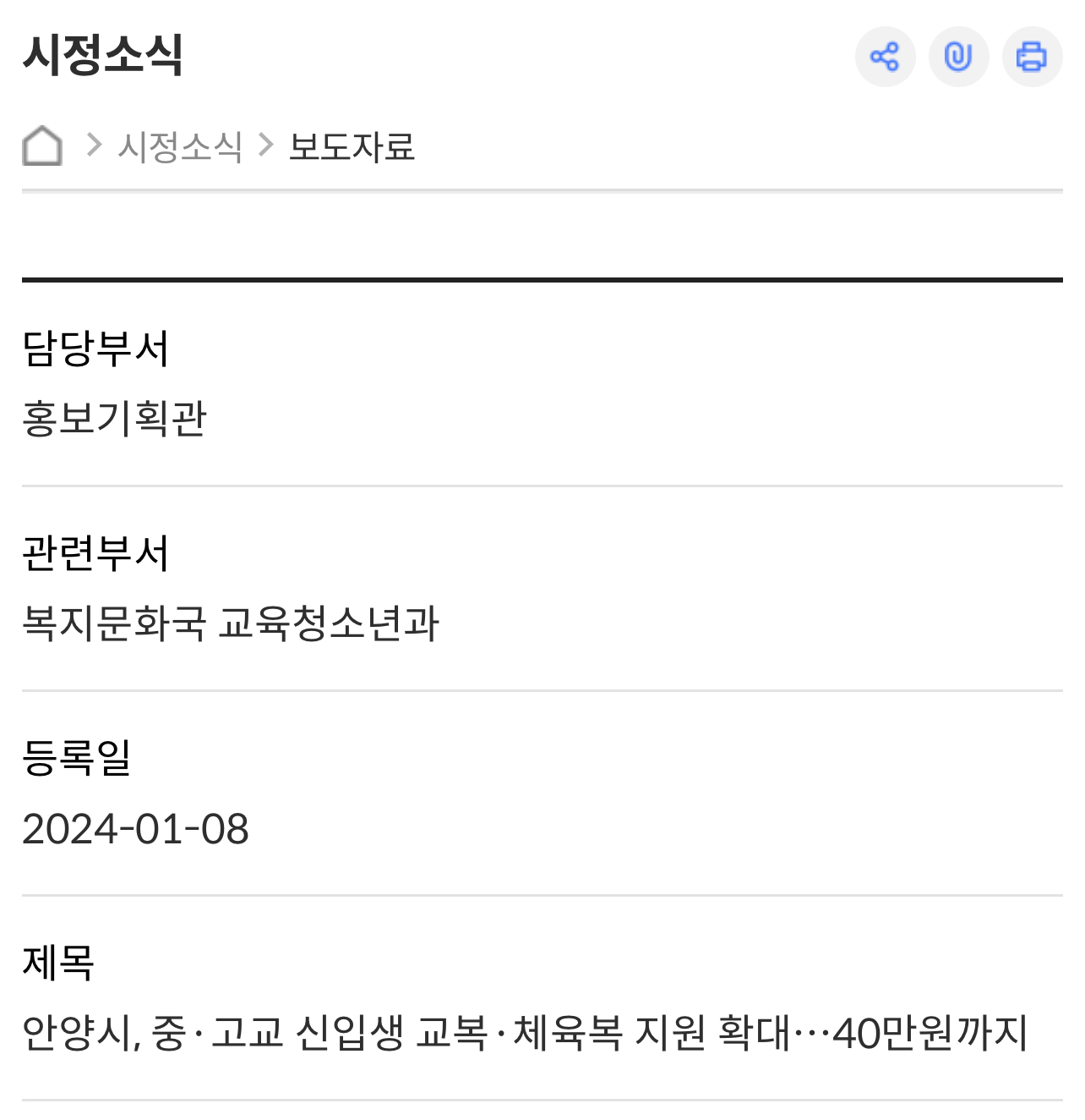 2024년 올해부터는 경기도와 경기도교육청 협력사업으로 추진해 교복 및 체육복·생활복 구입 비용을 40만원 이내로 확대 지원한다고 합니다.