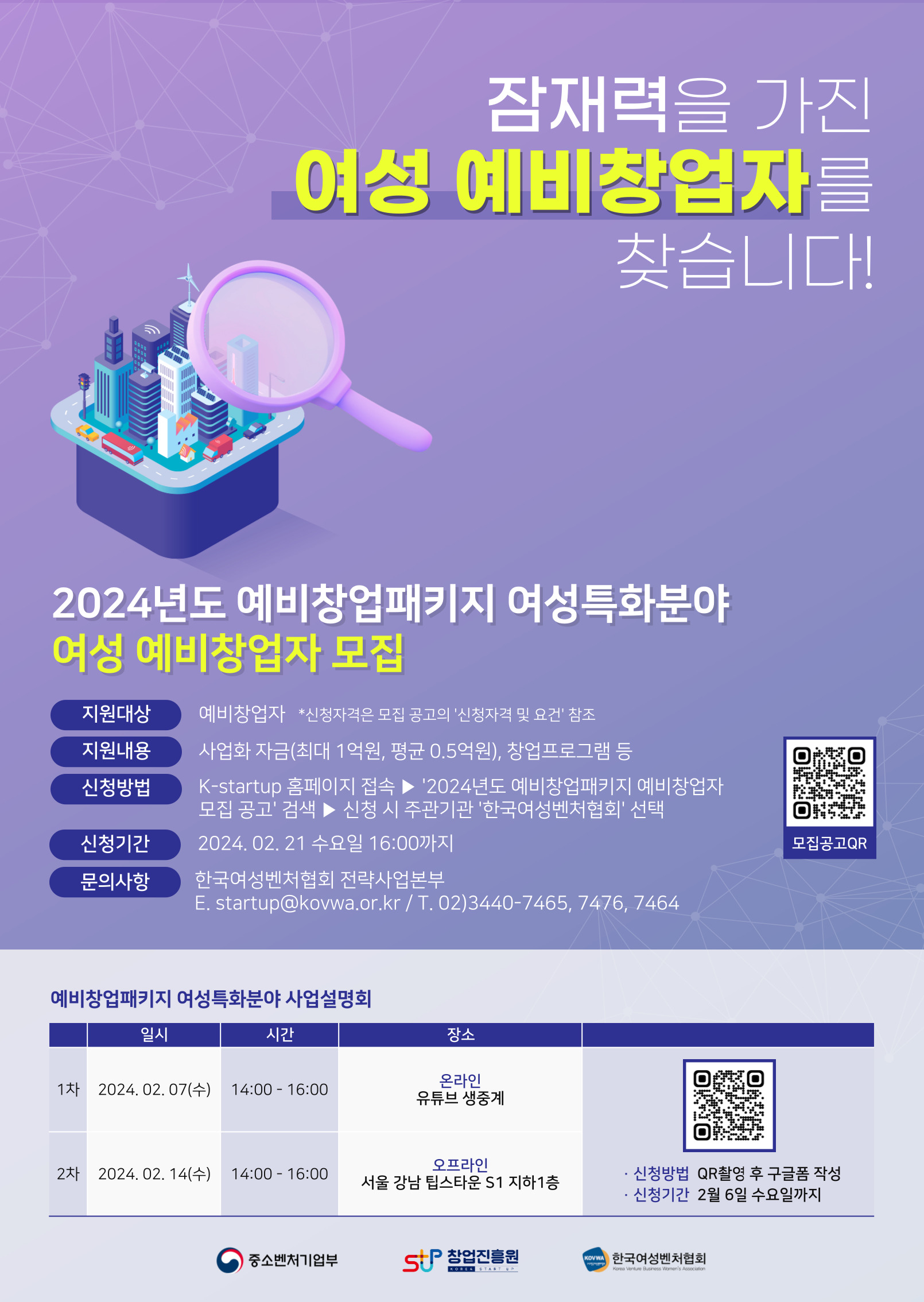 한국여성벤처협회는 '2024년 예비창업패키지 여성 특화분야'에 참여할 여성 예비창업자를 오는 2024년 2월 21일까지 모집한다고 밝혔습니다.